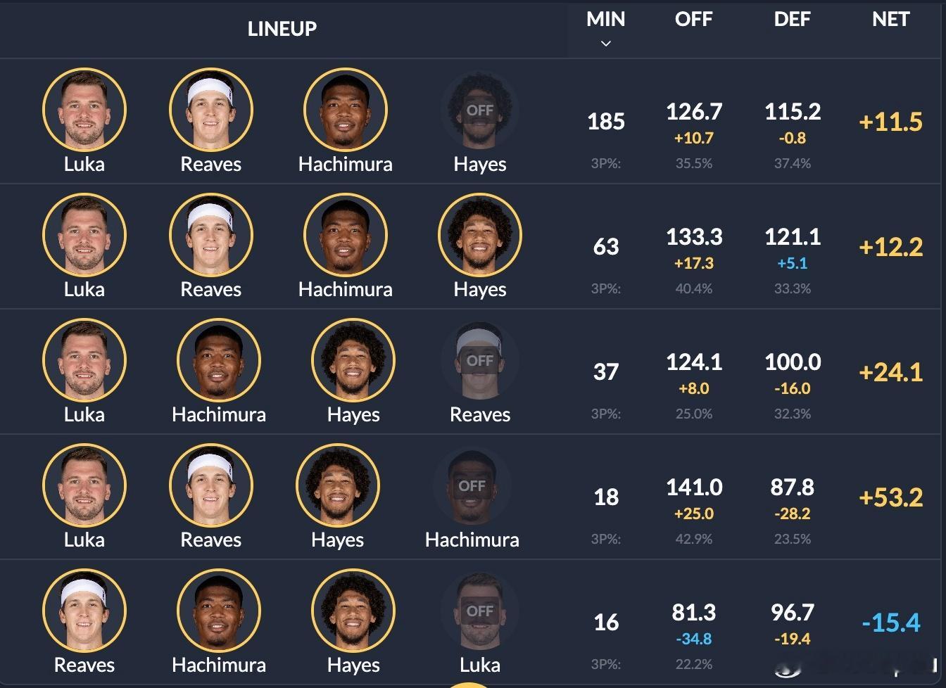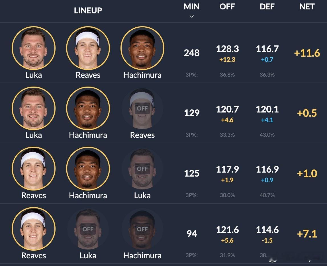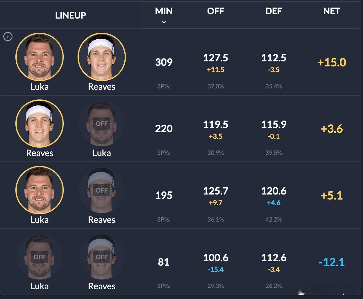 接下来的三个客场,猛龙、凯尔特人和76人,包括一个背靠背,将检验球队成色。输没问题,但得打出点心气,就像赛季初伤病那么多时还能拼下硬仗一样。20场打完也能做个小总结。之前我写过正负值不是一个有用的数据,那指的是单场正负值。正负值最有效的用法就是看不同组合的数值,由此判断不同组合是否有效。图1:077+里弗斯+艾顿+八村四人组,以及减掉其中一人后的正负值,印证了之前我说的艾顿和八村同时在场的防守问题。图2:077和里弗斯的双人组,极高的效率。图3:077+里弗斯+八村+海斯的四人组,八村明显更适合与海斯搭档内线。图4:077+里弗斯+拉拉维亚三人组,三人同时在场时间较少,但效率很高,但意外的是里弗斯单搭拉拉维亚是负的。图5:077+里弗斯+斯玛特三人组,同时在场的效率非常高。图6:077+里弗斯+八村三人组,三人同时在场时有着很好的进攻效率。