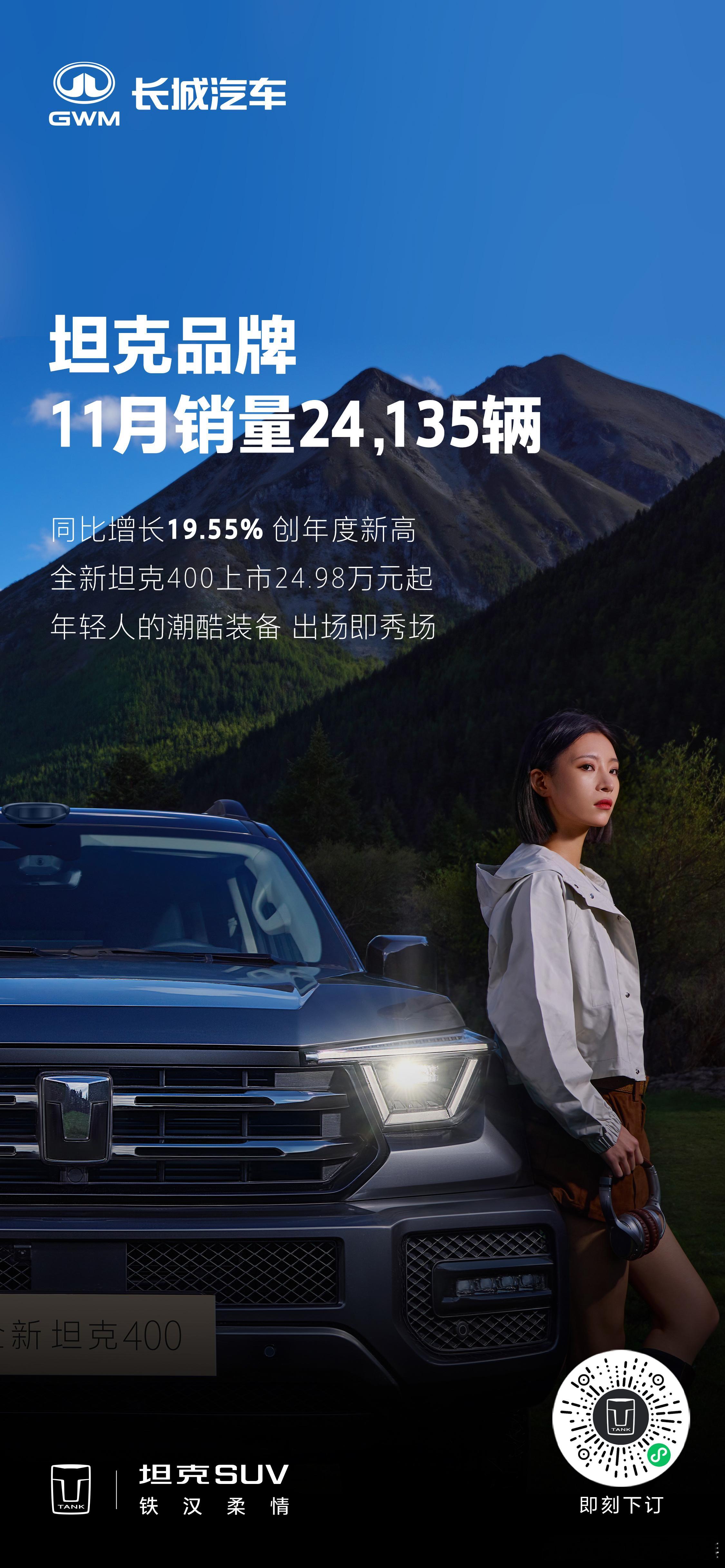 再创新高!坦克品牌11月销量24135辆感恩每位用户的信任与热爱一起开启中国越野新时代坦克铁汉柔情漫山遍野皆坦克