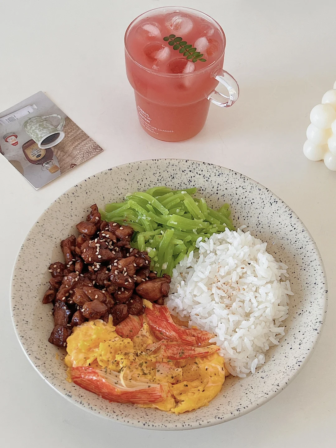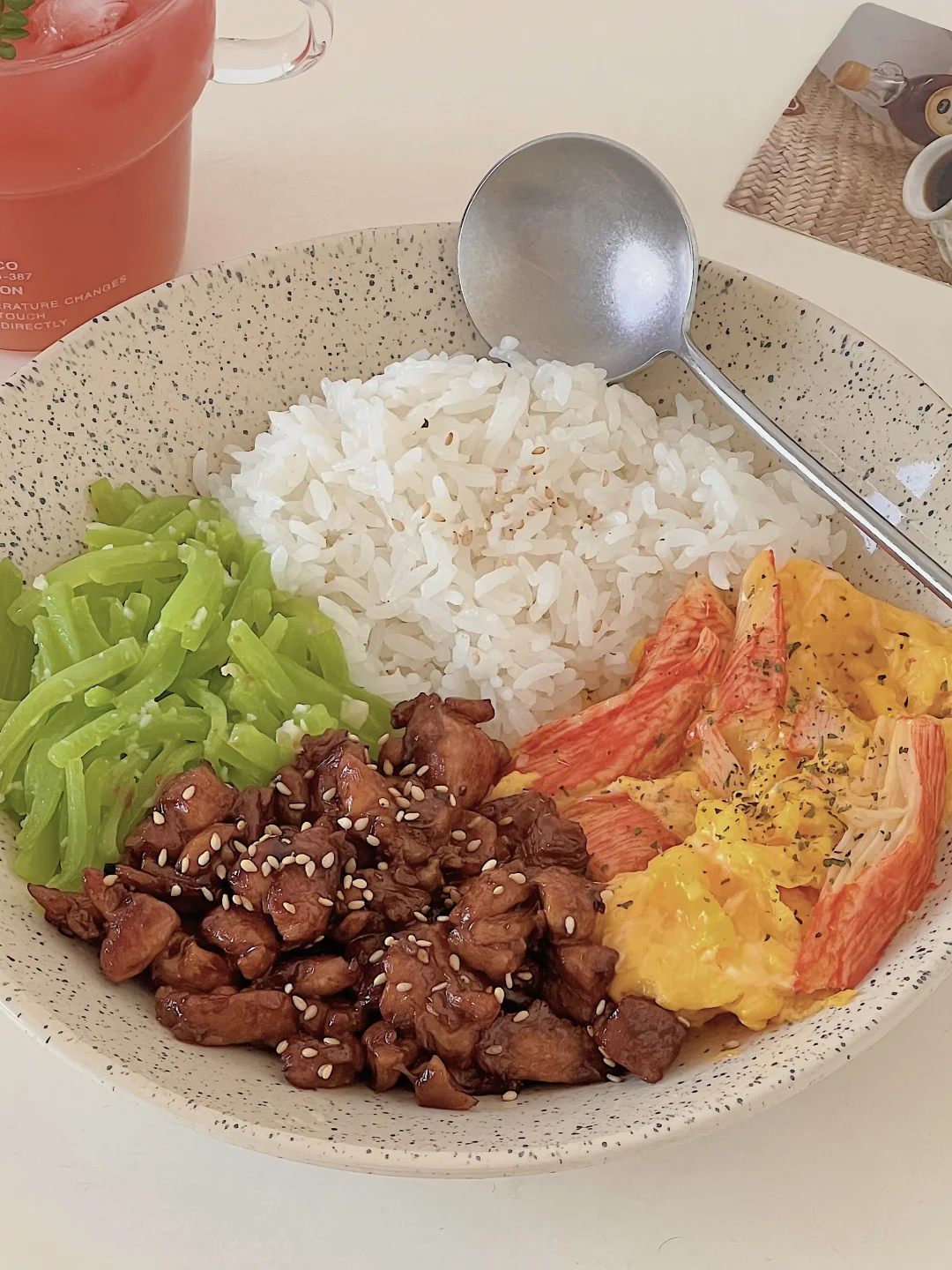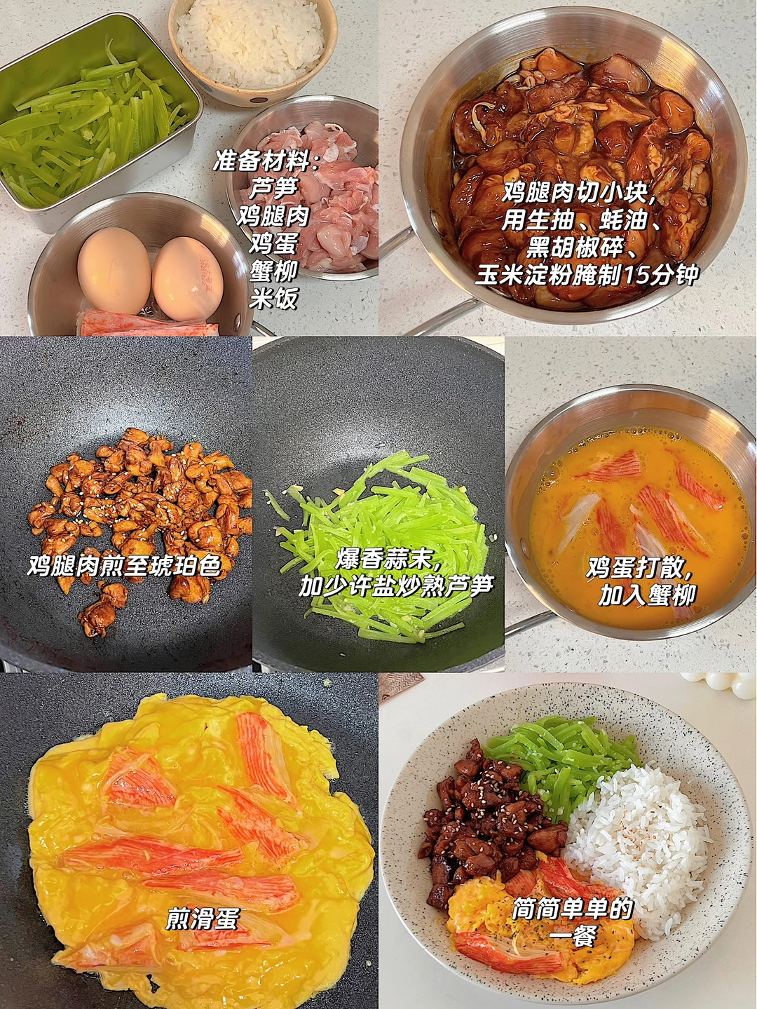 想要随便吃点结果又做大做强了 简单快手不难家常适合小白😊 做法: ✨鸡腿肉切小块,用生抽、蚝油、黑胡椒碎、玉米淀粉腌制15分钟,煎熟备用 ✨芦笋切丝,加少许盐炒熟 ✨鸡蛋打散,加蟹柳,煎滑蛋 ✨依次摆盘即可 拒绝外卖,自己做快餐🍱,足矣