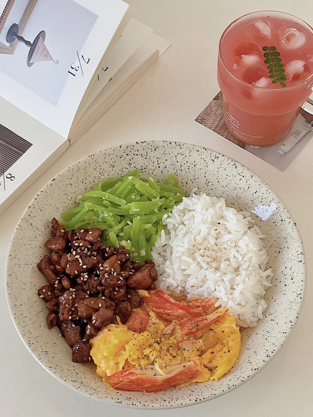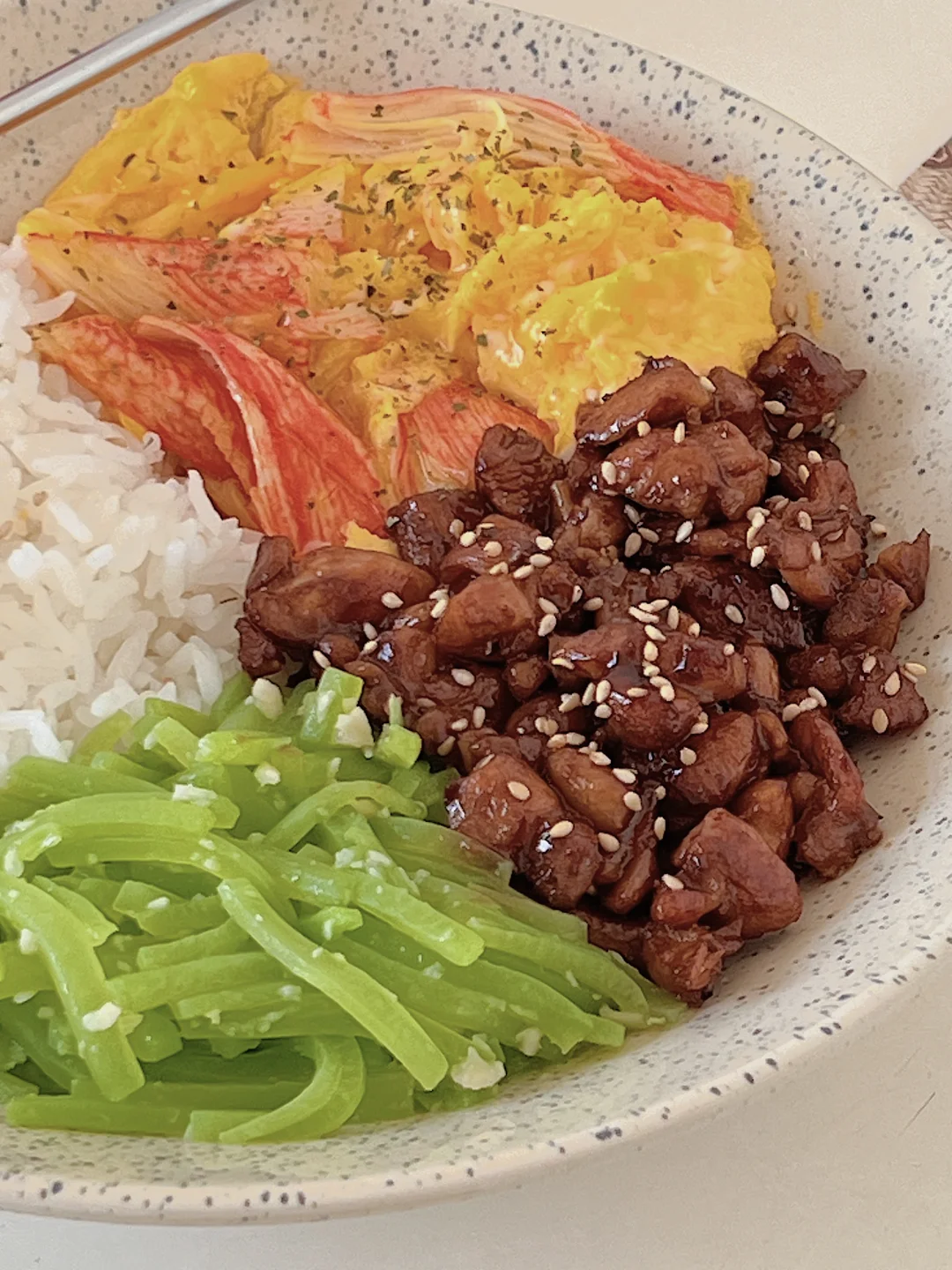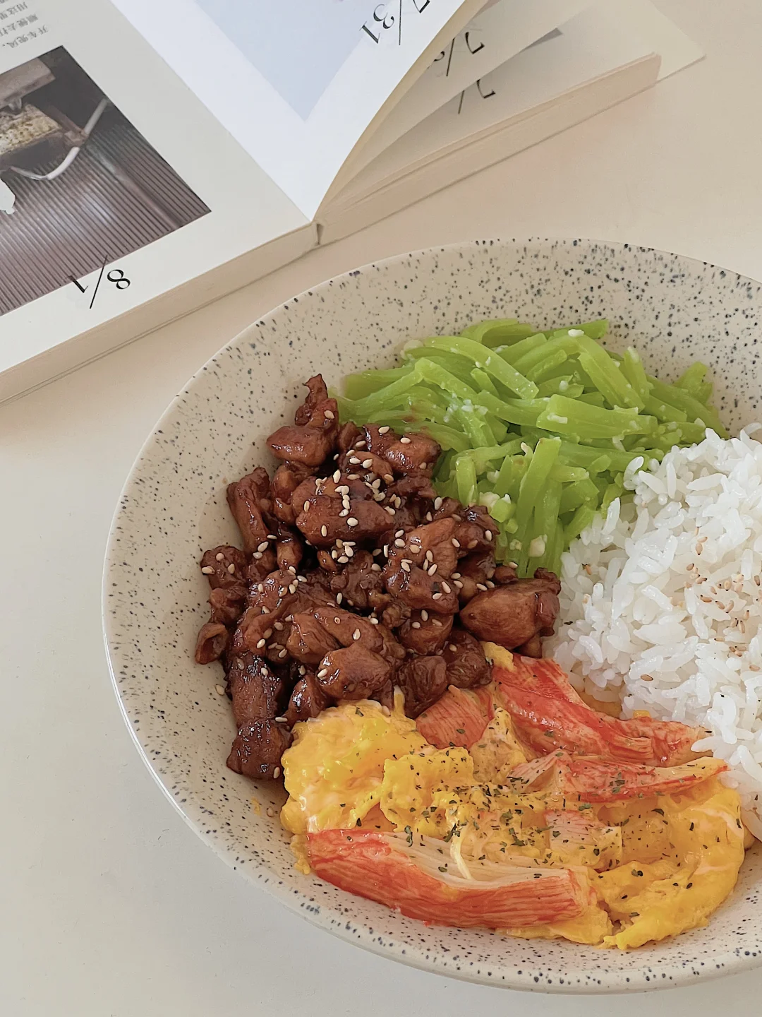 想要随便吃点结果又做大做强了 简单快手不难家常适合小白😊 做法: ✨鸡腿肉切小块,用生抽、蚝油、黑胡椒碎、玉米淀粉腌制15分钟,煎熟备用 ✨芦笋切丝,加少许盐炒熟 ✨鸡蛋打散,加蟹柳,煎滑蛋 ✨依次摆盘即可 拒绝外卖,自己做快餐🍱,足矣