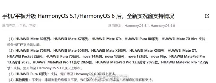 【华为鸿蒙OS全新实况窗适配情况公布】华为公布鸿蒙OS全新实况窗适配情况12 月 2 日消息,在今年 6 月的华为 Pura 80 系列及全场景新品发布会上,全新实况窗(取消了此前位于手机左上角的设定,与设备前摄融为一体)正式亮相,号称“无需打开应用状态一眼便知”。目前,华为官网现公布了升级 HarmonyOS 5.1 / HarmonyOS 6 后的全新实况窗适配情况。(IT之家)