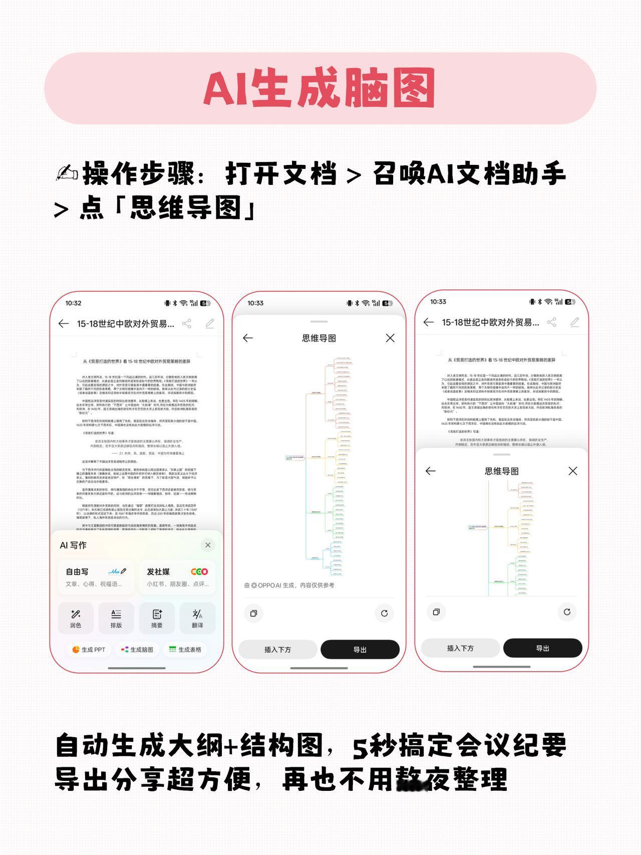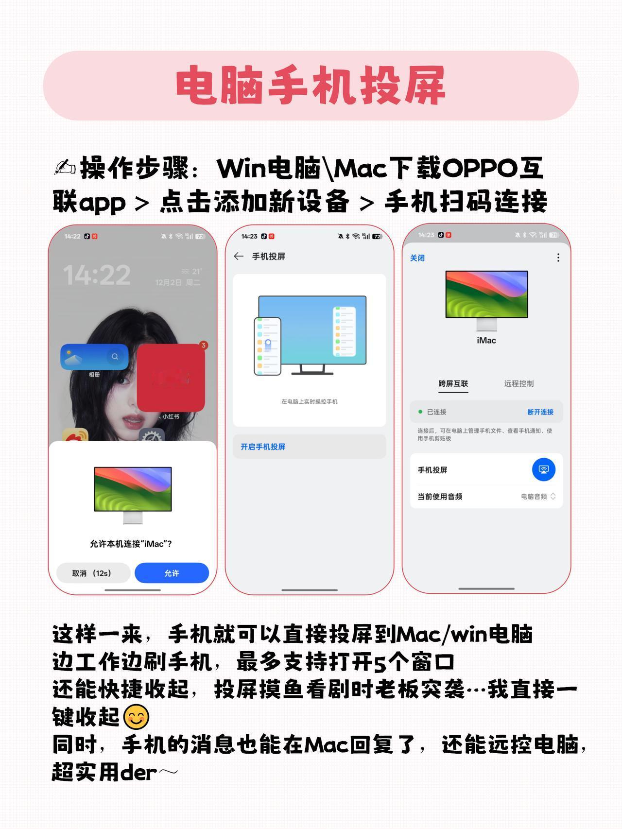 打工人必学!OPPO高效摸鱼指南来了🔥 用上📱OPPO Find X9 Pro后才发现 ColorOS16简直是打工人摸鱼+高效神器! 本打工仔挖到3个超实用小功能 亲测高效办公+摸鱼两不误👇 1⃣️AI生成脑图 ✍🏻操作步骤:打开文档 > 召唤AI文档助手 > 点「思维导图」 自动生成大纲+结构图,5秒搞定会议纪要 导出分享超方便,再也不用熬夜整理 2⃣️电脑手机投屏 ✍🏻操作步骤:Win电脑\Mac下载OPPO互联app > 点击添加新设备 > 手机扫码连接 这样一来,手机就可以直接投屏到Mac/win电脑 边工作边刷手机,最多支持打开5个窗口 还能快捷收起,投屏摸鱼看剧时老板突袭…我直接一键收起😊 同时,手机的消息也能在Mac回复了,还能远控电脑,超实用der~ 3⃣️一键转表格 ✍🏻操作步骤:桌面下滑搜「小布扫一扫」>选择文档>提取表格>拍张照 >转文档>自动生成 Excel 看文件的时候遇到价格表或数据,一键扫一扫转Excel 轻松变成可编辑的电子档,直接告别手敲👋 上周做项目对比,5分钟搞定数据整理,打工人必备~ 摸鱼要优雅 效率更要开挂! 这几个隐藏功能妥妥打工人外挂🌟大家快学起来~ 打工人OPPO Find X9