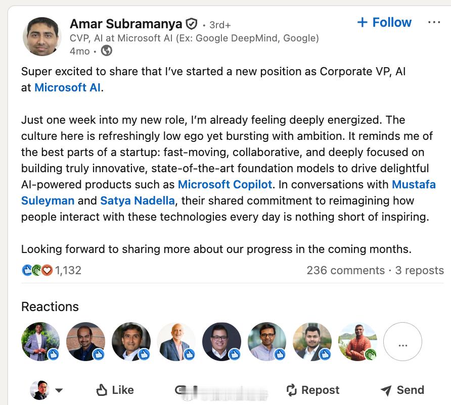 苹果的新任AI副总裁Aman Subramanya 四个月前才刚去微软出任CVP。他此前在谷歌工作了16年,最近的职位是Gemini团队工程主管。