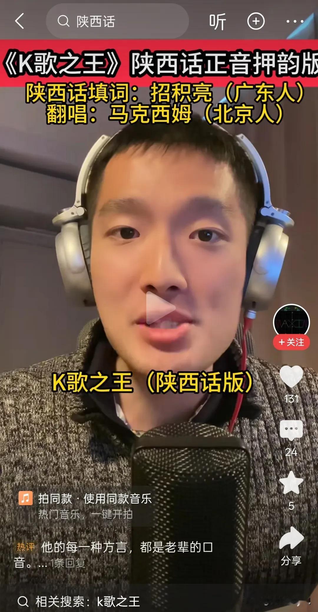 全网知名粤语推广博主马克西姆和本地粤语歌词二创博主招积亮,讲歌手陈奕迅演唱代表作的《k歌之王》改编成陕西话版。让经典粤语歌赋予新意思,很有趣的娱乐。推广粤语千万不能故步自封,自高自大,要有交流碰撞,要有方言联动,才能让粤语传播得更远。我们广东人学习陕西话就是一个不错的粤语推广创意。