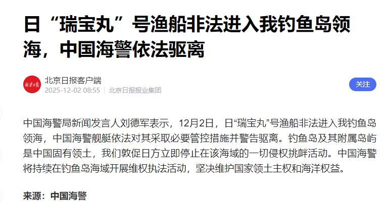 日本船只侵犯钓鱼岛领海,中国多门舰炮就位,不走就随时开火 12月2日,中国海警通报称,日本的“瑞宝丸”号渔船非法闯入了钓鱼岛领海,被中国海警依法采取管控措施并驱离。这艘“瑞宝丸”号是惯犯,曾至少3次闯入钓鱼岛领海并被中方驱离。 2023年7月闯过赤尾屿领海,2024年12月跑到钓鱼岛主岛附近挑衅,2025年7月刚被驱离没多久,转头12月就又卷土重来,仿佛觉得中国的领海是想来就来、想走就走的后花园。 更有意思的是,这艘总吨位还不到10吨的小渔船,每次闯入时都没携带任何捕捞设备,明眼人一看就知道,它根本不是来捕鱼的,就是打着渔船的幌子,背后受日本右翼势力操控,专门来试探中国主权底线的。 船长金城和司甚至还敢公开参加所谓“钓鱼岛问题”讲座,大言不惭地分享和中国海警周旋的“经验”,殊不知这种自欺欺人的表演,在绝对的实力差距面前不过是跳梁小丑的闹剧。 中国海警对这种挑衅行为早就有了成熟的应对方案,当天上午8时17分发现“瑞宝丸”号非法闯入后,正在附近执行常态化巡航的2305、2302舰立即启动应急响应,3分钟内就完成了战术合围,不给对方任何越界深入的机会。 海警官兵先是通过无线电用中、日双语喊话警告,明确告知其已侵犯中国领土主权,要求立即驶离,同时开启强光照射,从航路前方进行封堵,一系列操作专业又果断。 整个驱离过程仅用了47分钟,“瑞宝丸”号在强大的军事威慑下,只能灰溜溜地转向驶离,而一直徘徊在领海外侧的日本海上保安厅船只,从头到尾都没敢踏入中国领海半步,显然心里比谁都清楚,他们的行为属于非法侵权,根本站不住脚。 其实这些年中国海警在钓鱼岛海域的维权执法早就实现了常态化,2023年全年巡航天数达到了352天,一年365天里超过96%的时间,中国的海上执法力量都在这片海域坚守岗位,2022年是336天,2021年是332天,巡航天数逐年稳步上升,这种近乎全天候的存在,已经让钓鱼岛海域的实际管控态势发生了根本性转变。 早在2012年,中国政府就公布了钓鱼岛及其附属岛屿的领海基点基线,明确了领海范围,还把相关坐标表和海图提交给了联合国,得到了联合国的妥为公布,这在法理上为维护主权奠定了坚实基础。 从历史来看,钓鱼岛及其附属岛屿自古以来就是中国的固有领土,明清时期就被纳入海防管辖,二战后根据《开罗宣言》《波茨坦公告》,日本必须归还所有侵占的中国领土,钓鱼岛主权早已回归中国,日本所谓的“国有化”不过是单方面的无效操作,根本得不到国际社会的承认。 这些年日本类似的挑衅可不少,除了“瑞宝丸”号,还有“鹤丸”号等渔船也曾多次非法闯入,每次都被中国海警依法驱离。 但日方似乎总不长记性,频频派船只来挑衅,无非是想借助钓鱼岛问题遏制中国崛起,同时向美国递出投名状,换取在军事发展上的支持。 可他们偏偏选了最愚蠢的方式,用吨位不到10吨的小渔船去对抗中国吨位更大、装备更先进的海警舰,中国海警的舰艇不仅配备了先进的舰炮系统,还有完善的监控和威慑设备,舰炮就位从来都不是吓唬人的空话,而是维护主权的底气所在。 日本大概是忘了,现在的中国早已不是百年前的模样,在主权问题上,中国向来立场坚定、毫不含糊,任何企图分裂中国领土、侵犯中国权益的行为,都注定会遭到坚决反击。 “瑞宝丸”号一次次被驱离,就是最好的证明,再执迷不悟下去,下次面对的可就不只是驱离这么简单了。
