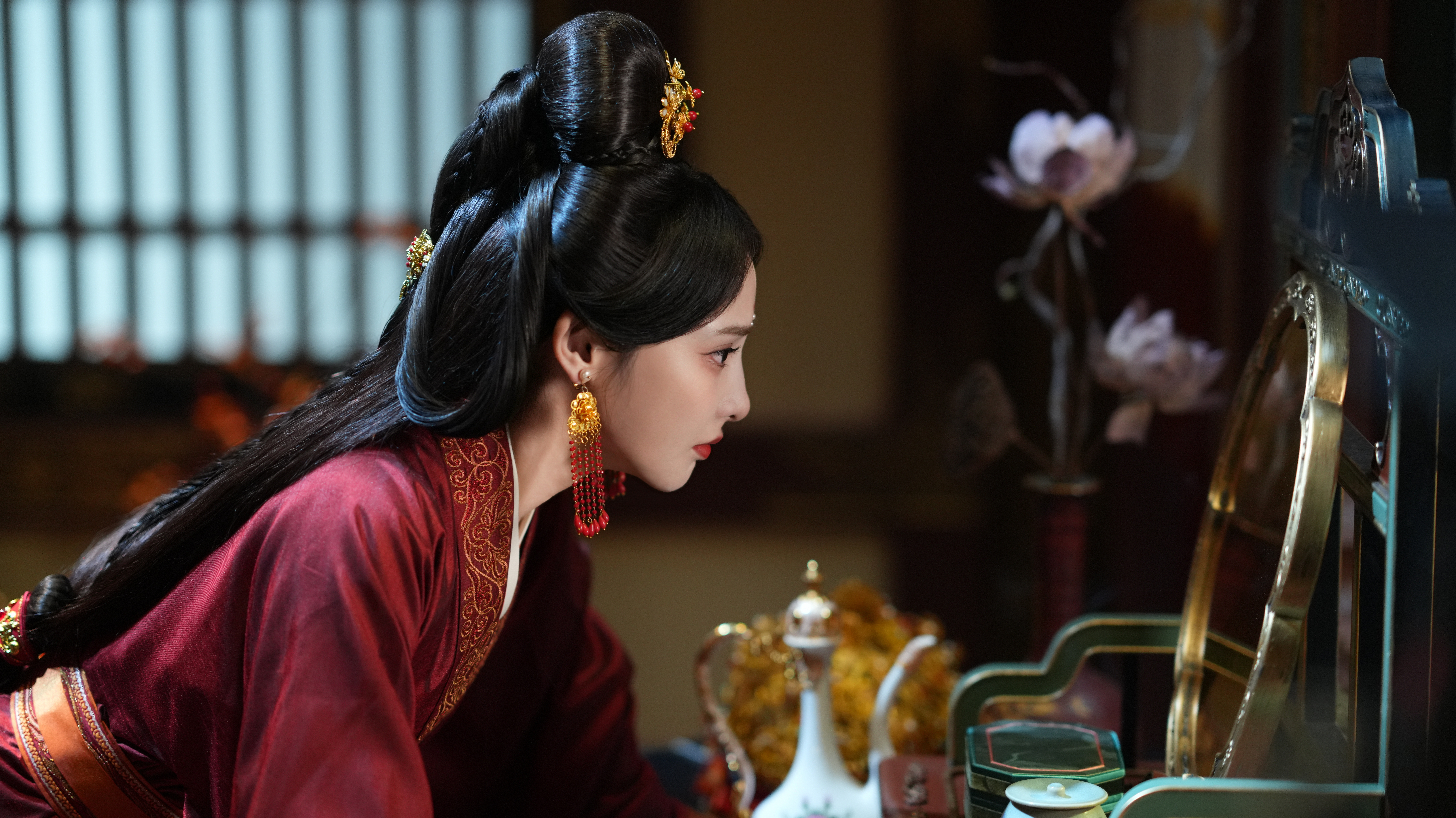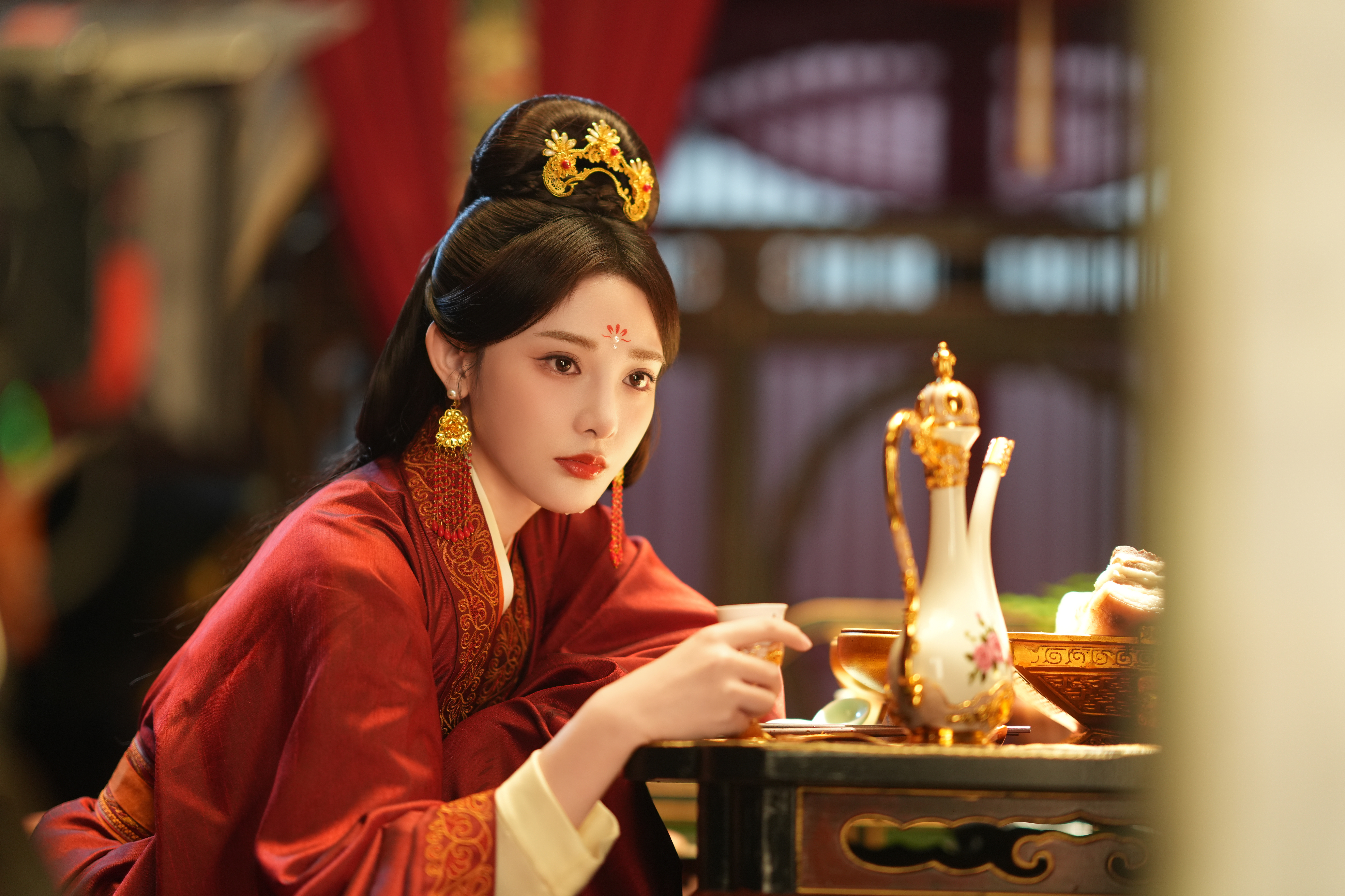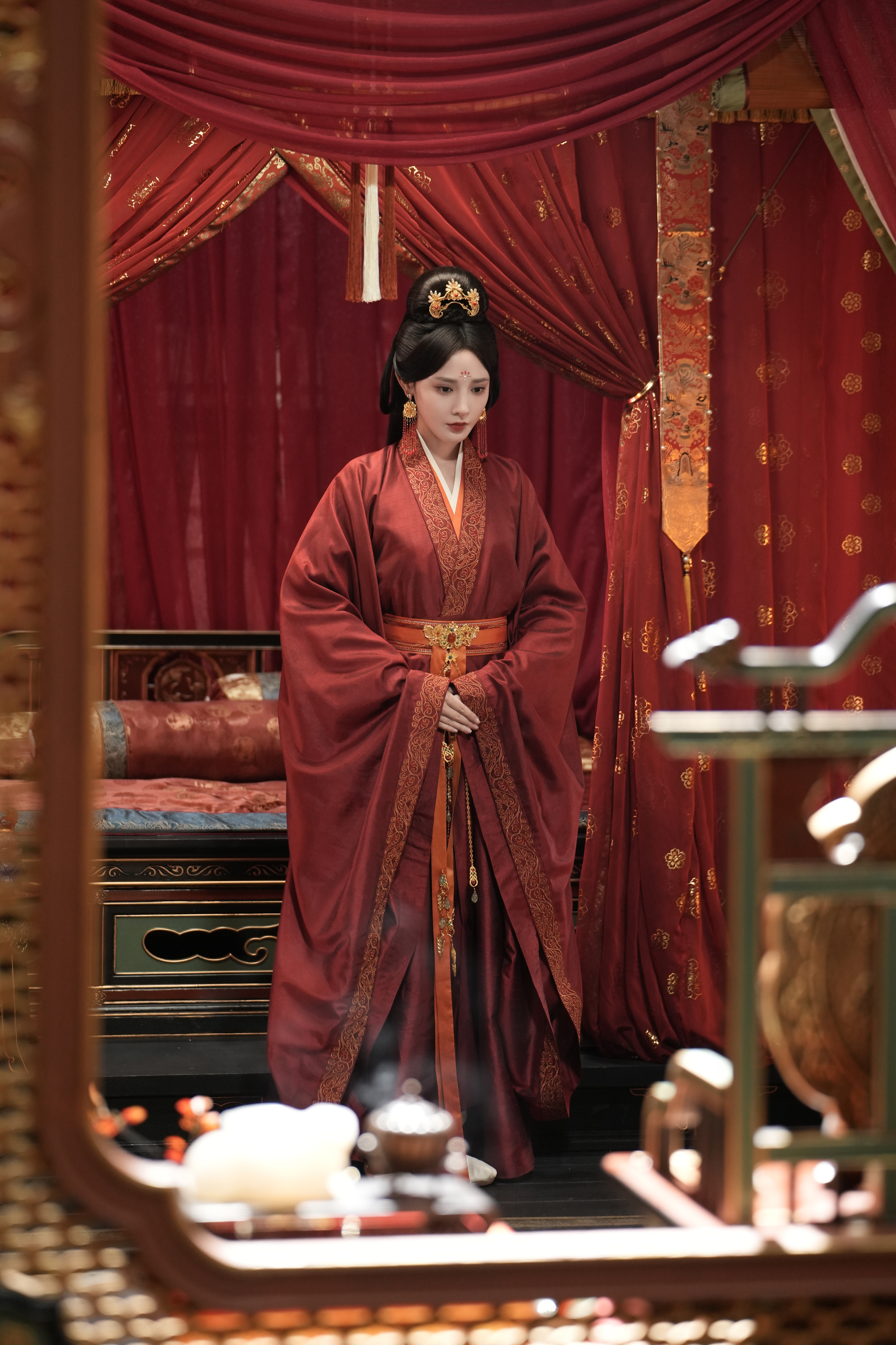 好喜欢这套彭小苒 《凤凰台上》凌苍苍☽ 剧照-嫁衣+花钿+珍珠妆+面帘