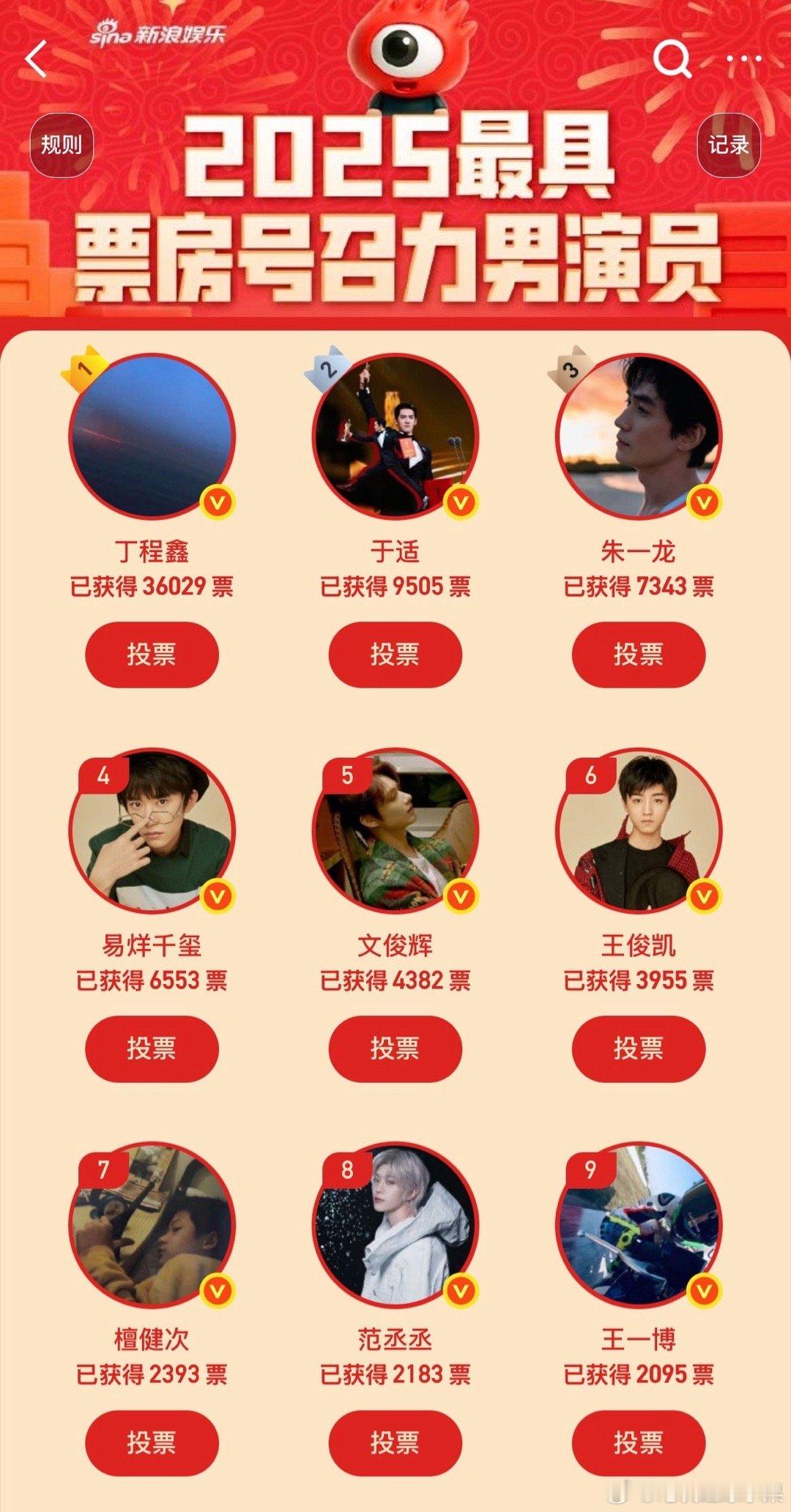 目前网友评出的2025最具票房号召力的男演员 票数从前到后分别是:丁程鑫 于适 朱一龙 易烊千玺 文俊辉王俊凯 檀健次 范丞丞 王一博肖战 成毅并没在这个行列2025最具票房号召力男演员 肖战好恐怖的面部肌肉控制力