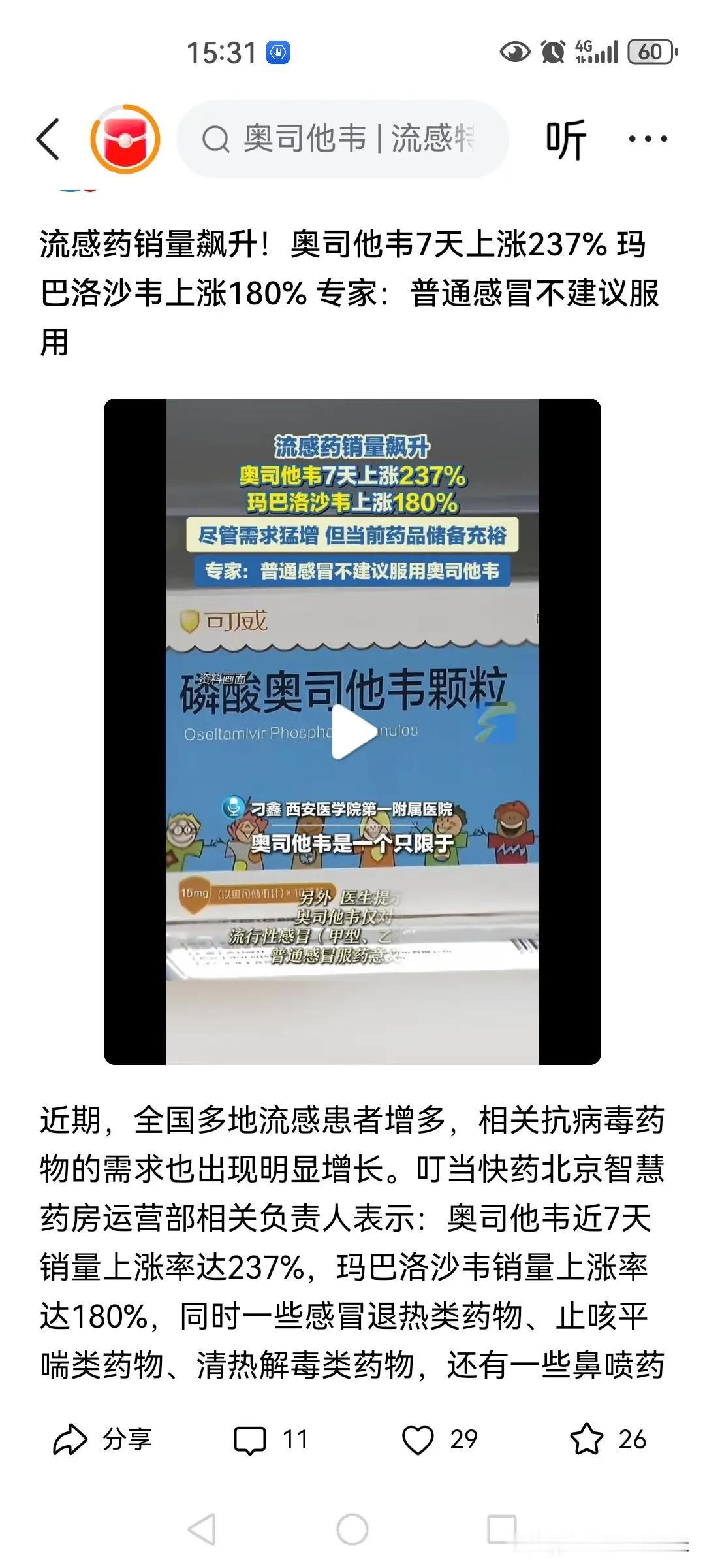 关于流感季节是否应该常备奥司他韦的问题,以下是一些建议和分析,供你参考: 流感季节是否应常备奥司他韦? **奥司他韦(商品名:达菲)**是一种抗病毒药物,主要用于治疗流感病毒感染,特别是在感染早期服用效果最佳。 是否需要囤药,主要取决于以下几个因素: 1. 个人健康状况 如果你或家人有慢性疾病、免疫力较低,感染流感后风险较高,提前准备药物可以在发病时及时用药。 年龄较大或有基础疾病的人群,尤其建议备一些应急药物。 2. 药品保存期限和存放条件 你提到一盒药快到期(四天、十八天),药品到期后不能使用,存放时间过长可能导致药效降低。 如果药品快到期,建议在到期前使用完,避免浪费。 3. 药品价格变化 目前价格上涨,囤药成本增加。 你可以权衡一下是否值得在价格较低时提前购买一部分备用药,但不要大量囤积,避免过期浪费。 4. 感染风险与供应保障 如果你担心感染流感,且在发病时难以及时买到药,提前备一些是合理的。 但也要考虑药品的有效期和存放条件,避免药品过期。 建议: 合理储备: 可以考虑在药品价格较低或促销时,适量购买几盒,确保在流感高发期能及时用到。 关注药品有效期: 避免囤积过期药品,药到期后应妥善处理。 咨询医生: 如果你有特殊健康需求,建议咨询医生或药师,确认是否需要提前准备奥司他韦,并了解正确的使用方法。 预防为主: 采取疫苗接种、勤洗手、保持良好的个人卫生习惯,是预防流感的有效措施。 总结: 不一定非得大量囤药,但在流感高发期,适量备一些奥司他韦以备不时之需是合理的。避免过度囤积,确保药品在有效期内使用,才能既保障健康,又避免浪费。 如果你有特殊情况或需要更详细的建议,建议咨询专业医生!