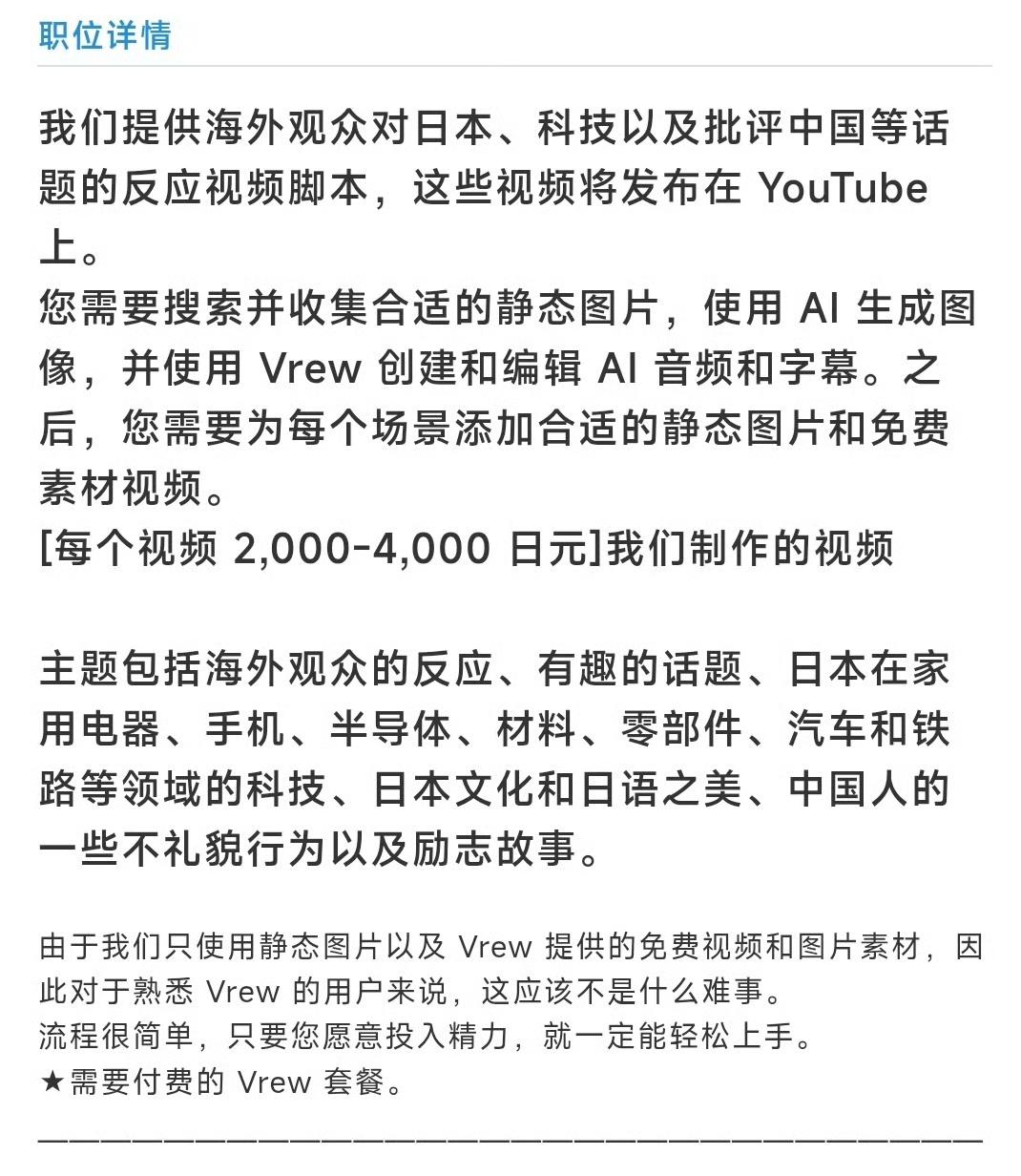 历史与事实,从来不是几条付费视频所能篡改,日本明码标价公然招募征集视频作者,任务居然是…… 12月2日经查,一条来自日本CrowdWorks平台的招募信息,赤裸裸揭露了蓄谋已久的对华舆论战,细节让人愤怒! 招募要求直白到刺眼:申请人必须是“热爱日本的人”,拿着平台提供的现成脚本,专门制作两类视频,一种吹嘘日本文化,家电、半导体、铁路等科技,美化日本文化与日语;另一种却固定设置“批评中国”抹黑主题,形成一条针对中国的“谣言流水线”。 这些带着明显偏见的视频将发布在YouTube上。每条视频给2000-4000日元(约90-180元人民币)。 而是这类招募并非临时起意,此前该平台已多次出现同类项目,背后隐约可见日本右翼势力的舆论渗透野心。 他们妄图用金钱收买话术,靠虚假叙事误导海外观众,却忘了:真金不怕火炼,真正的文化自信从不用贬低他人来证明,靠谎言堆砌的形象,终究经不起时间的检验。
