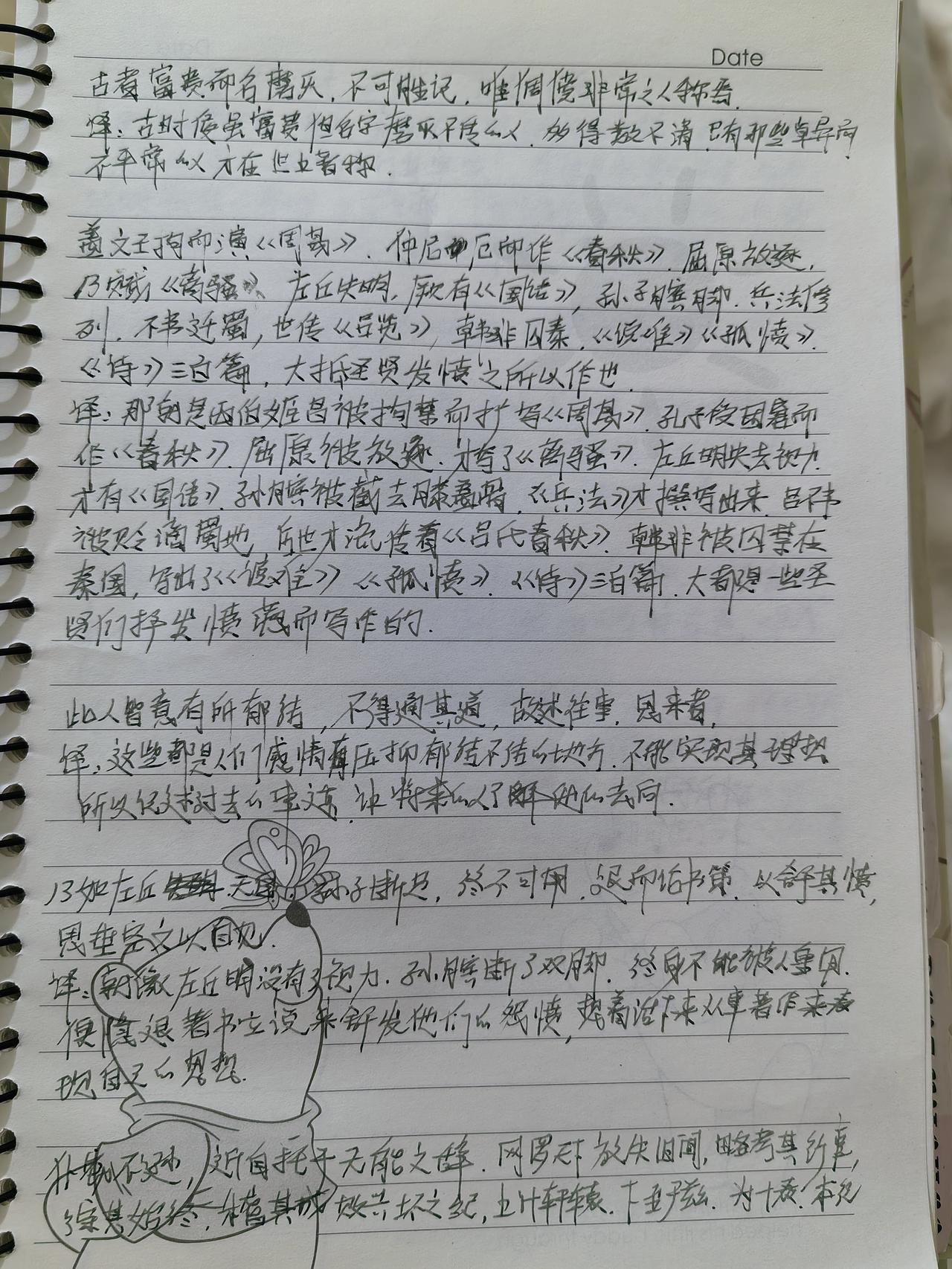 《报任安书》司马迁认为一般人没有不贪生怕死的,因为他们都会顾忌他们的父母妻儿。但是一些心中有大志愿的人可能会不同。 他认为一个勇士不一定要为名节去死,姬昌拘于羑里,推演出《周易》,孔子在非常窘迫的情况下写出了《春秋》等等,这些伟大之人在遭受磨难郁郁寡欢之时,通过著述立撰来向后人表达自己的思想。 司马迁刚刚完成《史记》初创之时,就飞来横祸,为了不至于《史记》夭折,他忍辱负重接受了最残忍的刑罚腐刑。 经过不懈的努力,惊世之作《史记》诞生。