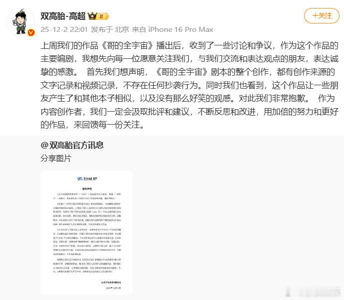 双高胎回应哥的全宇宙被指抄袭双高胎称不存在任何抄袭行为 此前,《哥的全宇宙》被指与《平行时空饭店》设定相似,引热议。对此,回应称《哥的全宇宙》剧本的整个创作,都有创作来源的文字记录和视频记录,“不存在任何抄袭行为.”