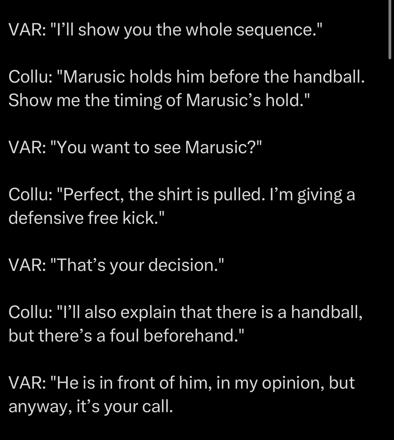 【克鲁对话VAR公开】• VAR:“我会给你看完整的回放序列。”• 主裁判:“马鲁西奇在手球之前拉拽了他,给我看马鲁西奇拉拽的时机。”• VAR:“你想查看马鲁西奇的动作吗?”• 主裁判:“很好,球衣被拽了,我要判防守方任意球。”• VAR:“这是你的决定。”• 主裁判:“我还要说明这里确实存在手球,但此前先有犯规。”• VAR:“我觉得他是在对方身前(的位置),不过不管怎样,这由你定夺。”大圣聊球大圣聊球意甲意甲