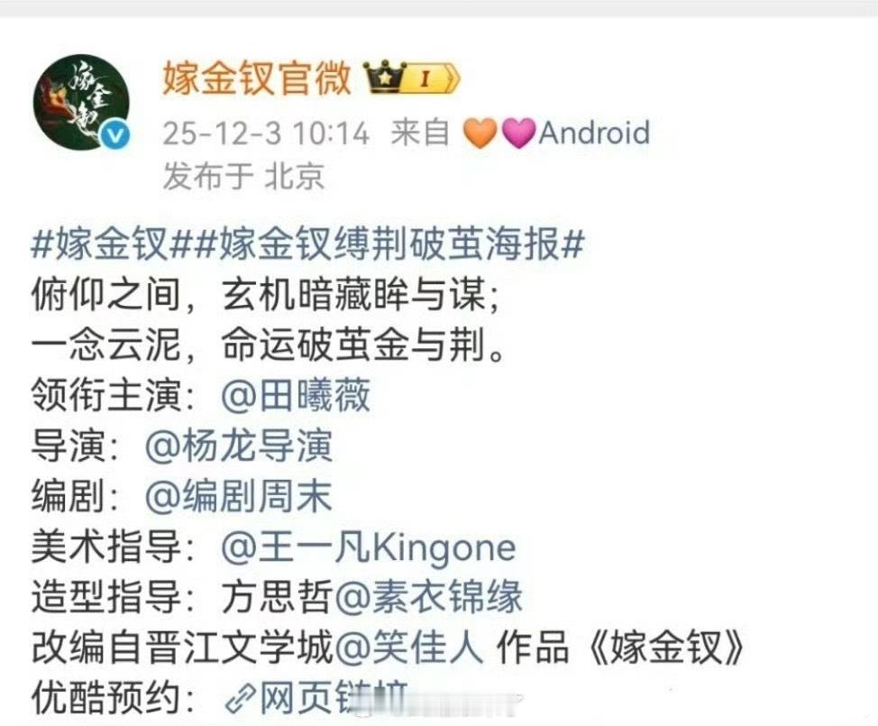 田曦薇嫁金钗单人官宣田曦薇《嫁金钗》正式官宣单人官宣➕班底官宣