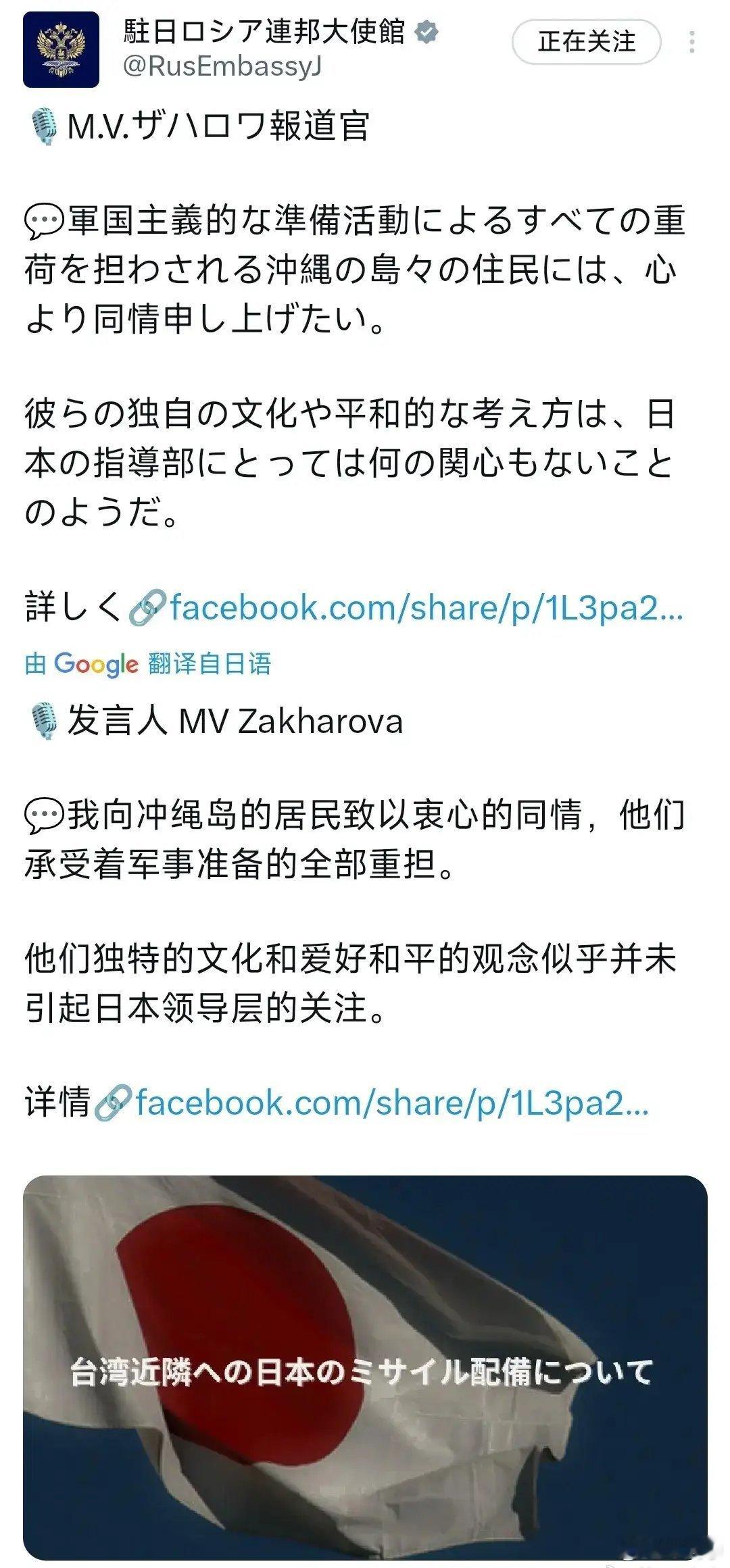 中俄就涉日本问题进行战略对表 就琉球问题,俄罗斯驻日本大使馆贴文写道:我向冲绳岛的居民致以衷心的同情,他们承受着军事准备的全部重担。他们独特的文化和爱好和平的观念似乎并未引起日本领导层的关注。 旧金山和约,中俄都没有参与,是美日私下双方条约,没有国际效力。当日本跳的时候,中俄就有权按开罗宣言和波斯坦公告来要求日本了。琉球群岛现在地位为定论要好好炒起来。