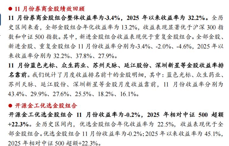 关于券商金股有没有用,再来用实例回复一下: 一例是一位朋友的现身说法,他是一位有心人,用我年中发布的某家机构下半年金股做了个组合,下半年持续跟踪了一下收益率,结果挺喜人。 如果觉得这个案例是单个样本没有说服力的话,开源证券定期会对所有券商金股进行分析,12月的报告中,对前11个月的金股大样本分析结果如下:11 月份券商金股组合整体收益率为-3.4%,2025年以来收益率为32.2%。全历史区间来看,全部金股组合年化收益率为13.2%,收益表现显著优于沪深 300 指数和中证 500指数。 我还是那句话:各家券商每月初对外披露的十大金股,高度汇集了分析师的研究精华,融合了风格选择、行业配置、选股择时等多维度的研究观点。可以不认同,也可以在此基础上进行自己的优化,但是无论是嗤之以鼻还是持仓高度集中的人,大概率都是远远被这些组合抛在身后的。