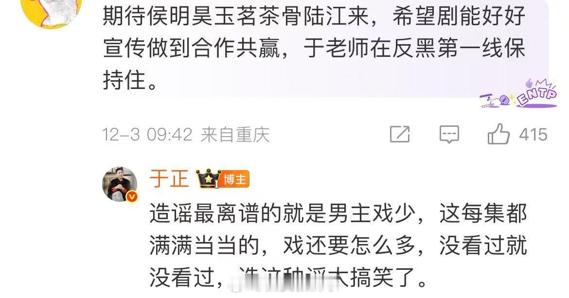 【于正回应玉茗茶骨男主戏份少】于正说造谣最离谱的就是玉茗茶骨男主戏少12月3日,发文称电视剧《玉茗茶骨》站内预约人数突破100万。随后,于正在该条博文评论区回应网传《玉茗茶骨》男主戏份少,于正表示:造谣最离谱的就是男主戏少,这每集都满满当当的,戏还要怎么多,没看过就没看过,造这种谣太搞笑了。玉茗茶骨