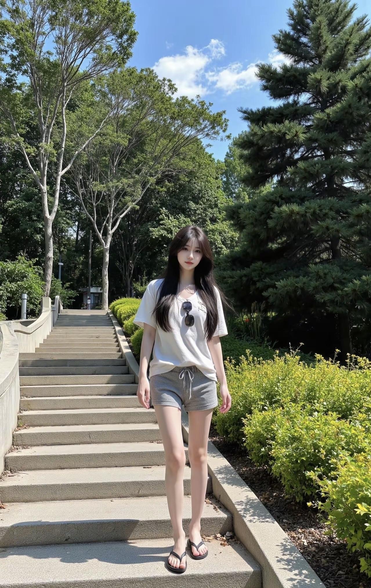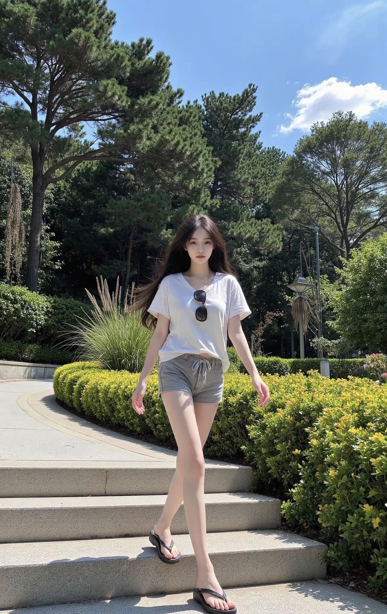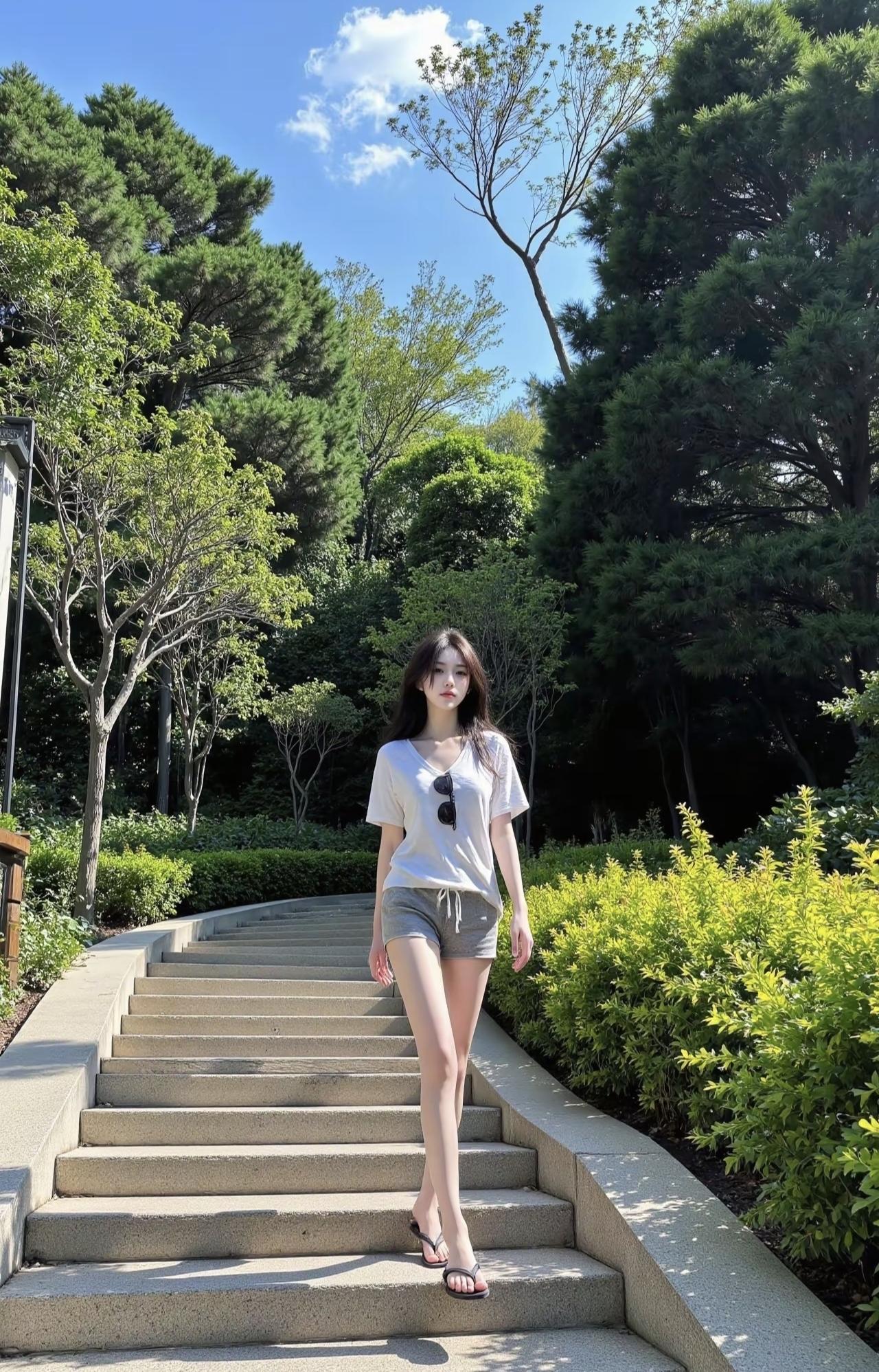 晴日把绿意揉得很软,风裹着草木香漫过石阶。白T恤和拖鞋是松弛的注脚,连影子都跟着轻起来。