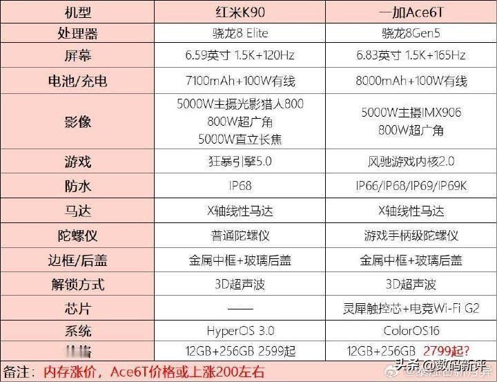 一加ACE6T简单对比红米K90[思考]ACE6T起售价如果和红米一样是不是挺香的,不要那颗小长焦 换来更大的电池容量[奸笑]注意ACE6T是8300毫安,比机身尺寸也比红米大不少,起售价一样不太可能,毕竟还有ACE6标准版,但是对比ACE6升级又不算多[捂脸]定价不好定啊