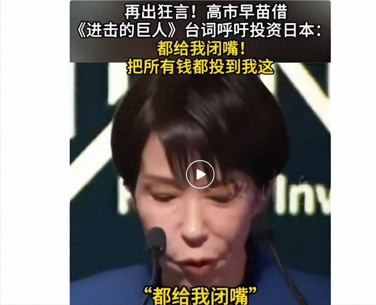 “都给我闭嘴!”高市早苗,再出狂言!日本“瑞宝丸”号渔船非法进入我钓鱼岛领海! 最近两天,日本政坛接连上演的两出戏,一边让人看得哭笑不得,一边又让人不得不提高警惕。 12月1日,日本首相高市早苗在东京的国际投资会议上,对着全球投资者喊出“都给我闭嘴!把钱都投到我这儿来!”的狂言,还说这是引用了动漫《进击的巨人》的台词; 转天,日本“瑞宝丸”号渔船就非法闯进我国钓鱼岛领海,被中国海警依法驱离。这两件事凑在一起,不光暴露了高市早苗的无知,更藏着日本当前内外交困下的焦躁与算计。 高市早苗那出“二次元招商”的闹剧。她大概觉得用热门动漫台词能拉近距离,显得接地气,却压根没搞懂这句台词的真正含义。 有看过《进击的巨人》的年轻朋友估计都知道,说这话的主角艾伦,后期可是黑化成了屠杀世界80%人口的反派,而且说完这句狂言没多久,就被同伴狠狠教训了一顿,妥妥的“狂妄必败”的预兆。 高市早苗在国际会议上对着投资方说“闭嘴”,不光是没礼貌,更是找错了典故、踩错了点。日本网友都炸了锅,吐槽她这是“全垒打级的蠢事”,还调侃“该有人让她自己赶紧闭嘴”。其实明眼人都能看出来,她这不是玩梗,是急了。 日本经济现在一团糟,第三季度GDP都在下滑,债务突破GDP的200%,急需外资输血,急到只能靠这种出格言论博眼球,可偏偏连引用的台词都没搞明白,足见其政治素养有多欠缺。 高市早苗1日刚喊完狂言,日本就在2日派“瑞宝丸”号闯钓鱼岛,这绝不是巧合。 这艘“瑞宝丸”可不是普通渔船,而是个惯犯,两年多里多次非法闯入我国钓鱼岛相关海域,船长还公然分享和中国海警周旋的“经验”,背后明显有日本右翼势力操控。 日本1日还在所谓“领土主权展示馆”搞小动作,拿出几份断章取义的历史碎片当“证据”,企图歪曲钓鱼岛归属事实,转天就派船实地试探,摆明了是想“虚实结合”制造争议。 不过日本的算盘显然打错了。中国海警在钓鱼岛海域的维权执法早就常态化了,这次处置“瑞宝丸”号时,3分钟就完成合围封锁,舰艇搭载的76毫米速射炮、高压水炮全程待命,日方保安厅的船只能在领海外远远观望,根本不敢上前。 这背后是我国海警24小时不间断的海空立体监控,2024年曾创下连续216天巡航的纪录,如今更是高频次巡逻,钓鱼岛海域的管控早已全方位覆盖,日本想靠几艘小渔船搞小动作,纯属自不量力。 把这两件事串起来看,就能看清当前的局势:日本国内经济复苏乏力,高市早苗政府拿不出像样的解决方案,只能靠出格言论急着招商引资;对外又想靠挑衅我国主权转移国内矛盾,试探我国底线。 可这种内外失衡的操作,注定是竹篮打水。 高市早苗连动漫台词的含义都搞不懂,暴露了她的草率与无知;日本在钓鱼岛问题上的反复挑衅,更是违背国际法准则,只会不断损耗自身的国际信誉。 说到底,无论是招商引资还是处理国际争端,靠狂言和挑衅都解决不了问题。 高市早苗要是真懂《进击的巨人》,就该知道艾伦的狂傲最终换来的是毁灭;日本要是真认清现实,就该明白钓鱼岛是中国固有领土,任何侵权挑衅都只会自食恶果。 国际社会认的是实力和道理,不是中二的台词,更不是非法的挑衅,这一点,日本显然还没真正明白。