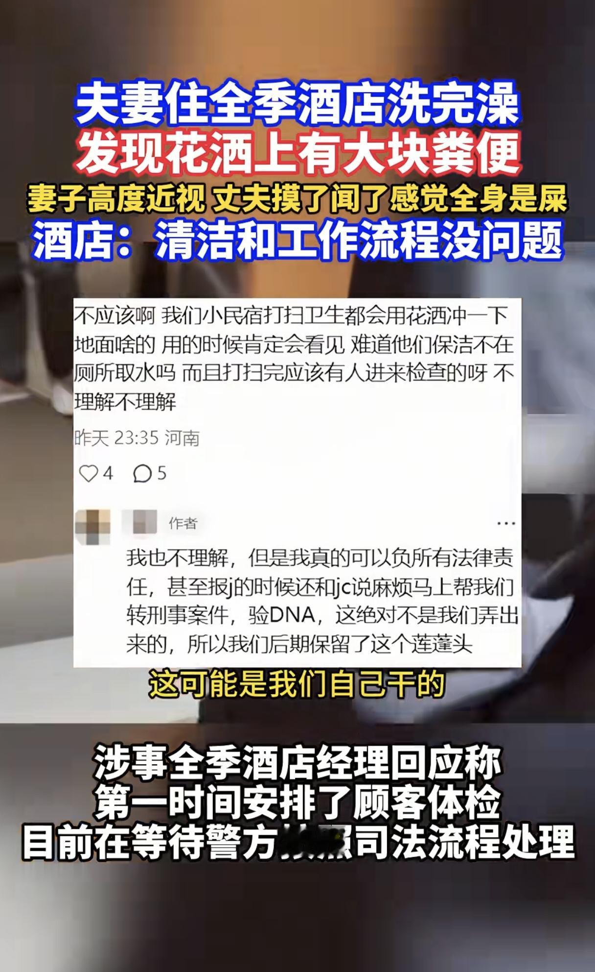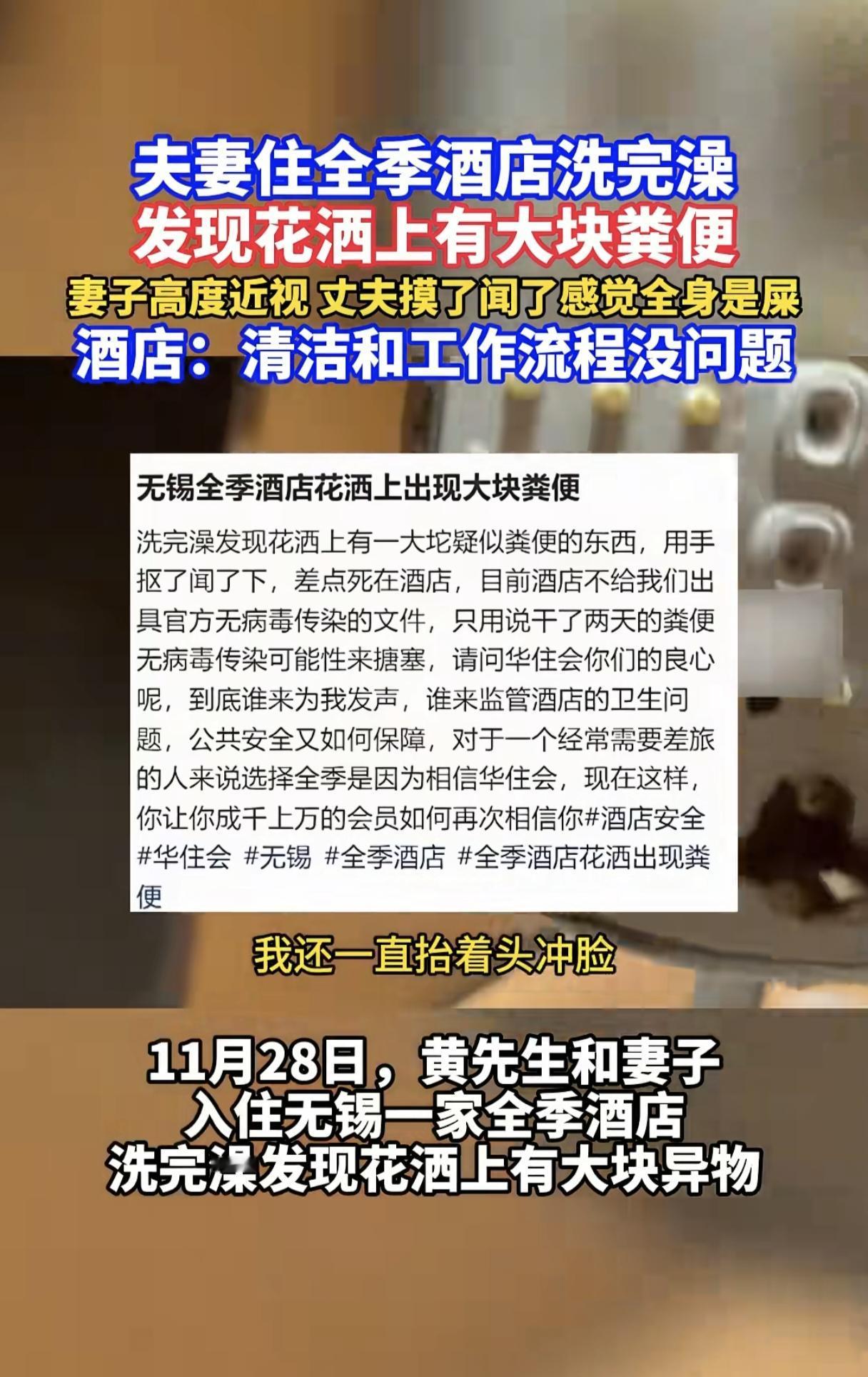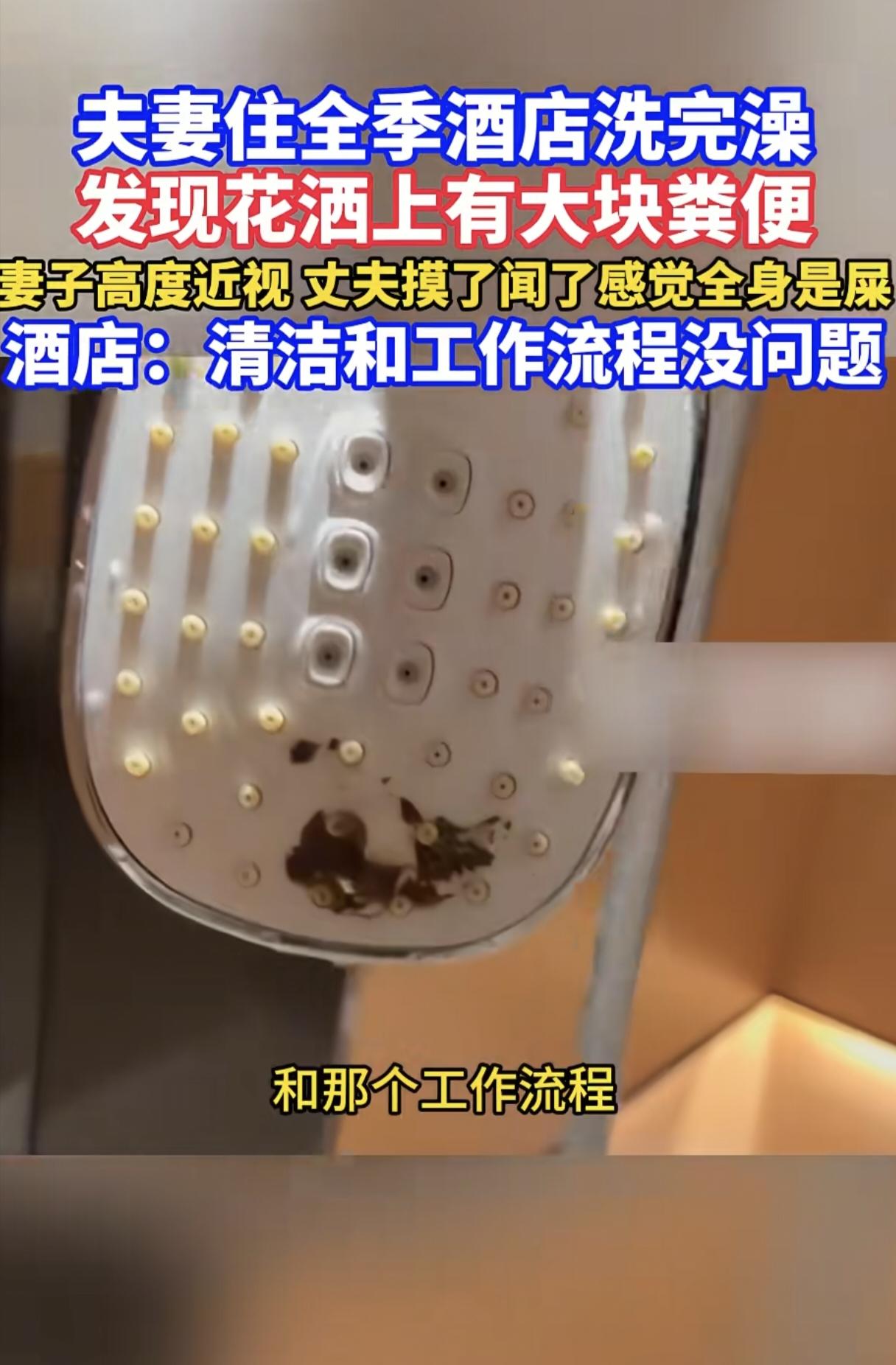 太恶心了!一夫妻在全季酒店洗澡的时候,竟然发现花洒上有粪便,男子还一直抬头冲脸,洗完用手去摸,还闻了下,顿时觉得浑身恶心。 因为妻子眼睛近视,所以洗澡时候没有发现。 男子洗了大概有20分钟,还一直抬头冲脸,发现有异物后,才伸手去摸,发现竟是粪便,还有一部分已经冲掉了。 夫妻俩顿时觉得恶心的不行,而且两人都有外伤,担心感染。 找到酒店后,酒店回复工作流程是没有问题的,竟还隐晦的表示,可能是他们夫妻俩自己干的。 酒店也在第一时间陪夫妻俩去医院做了检查,现在已经报警处理。 网友觉得,出了这么糟心的事,酒店没有第一时间认错误道歉,而是狡辩,还是让人无法接受的。 用酒店的东西还是要仔细检查一遍,也希望相关部分加大监管力度,让出门在外的人能住的卫生,住的安心!