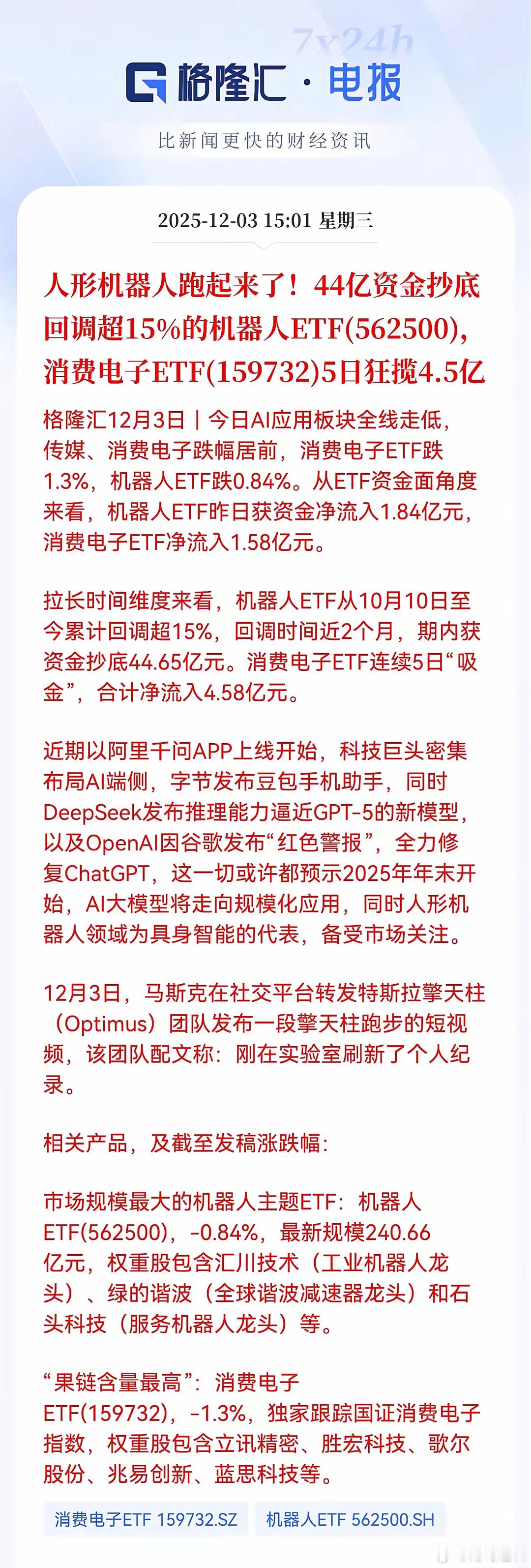 人形机器人跑起来了!资金提前嗅到变革的气息?44亿资金抄底回调超15%的机器人ETF(562500),消费电子ETF(159732)5日狂揽4.5亿。 当马斯克旗下特斯拉Optimus团队发布人形机器人跑步视频,刷新实验室个人纪录的那一刻,资本市场已提前嗅到变革的气息。格隆汇电报数据显示,2025年12月3日,机器人ETF(562500)获1.84亿元资金净流入,而消费电子ETF(159732)亦录得1.58亿元资金加仓,科技赛道暗流涌动。这场投资热潮并非偶然。拉长时间线,机器人ETF自10月10日以来累计回调超15%,近两个月内吸引44.65亿元抄底资金;消费电子ETF则连续5日吸金,合计净流入4.58亿元。两大科技主线同步崛起,背后是AI产业化落地的清晰信号。从字节跳动推出豆包手机助手,到DeepSeek发布推理能力逼近GPT-5的新模型,再到OpenAI因谷歌“红色警报”全力修复ChatGPT,科技巨头正密集布局AI终端侧,预示2025年末将迎来AI大模型规模化应用拐点。作为科技赛道的具身智能代表,人形机器人成为资金聚焦的核心。市场规模最大的机器人ETF(562500)权重股涵盖工业机器人龙头汇川技术、全球谐波减速器龙头绿的谐波及服务机器人龙头石头科技,形成全产业链布局。消费电子ET(159732)则于“果链含量最高”著称,重仓立讯精密、胜宏科技等消费电子供应链龙头,同步受益于AI硬件创新周期。当前,AI应用板块调整已近尾声,44亿资金抄底机器人ETF的举动,彰显机构对科技赛道长期价值的共识。随着人形机器人技术突破与消费电子创新周期共振,科技投资正迎来具身智能与AI终端的双重驱动时代