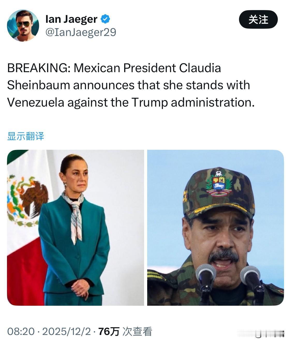 突发新闻:墨西哥总统克劳迪娅·欣鲍姆宣布,她将与委内瑞拉站在一起,反对特朗普政府。