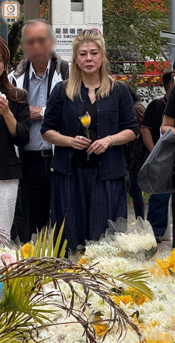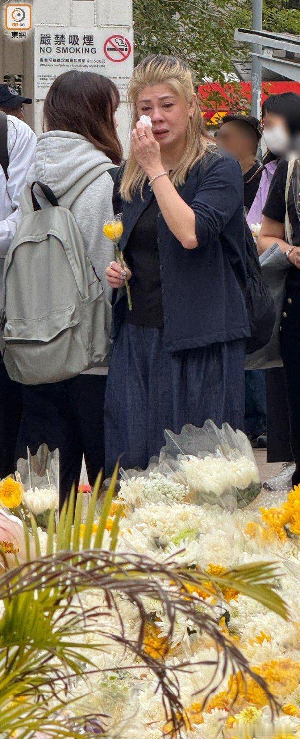 大埔宏福苑五級大火,連日來有不少市民自發到災區附近的休憩處,向遇難者獻花,現場形成一片花海,附近涼亭亦貼滿寫上祝福和悼念字句的紙條,向遇難者作追思。今日(2日)是遇難者「頭七」,藝人梁藝齡約下午4時許與友人抵達獻花處,手持黃色鮮花的梁藝齡神情哀傷,她抵達後即忍不住哭起來,又以紙巾擦拭眼淚,她拿著鮮花望向花海和遠處的災區若有所思,隨後將鮮花放在花海中便跟友人離去。