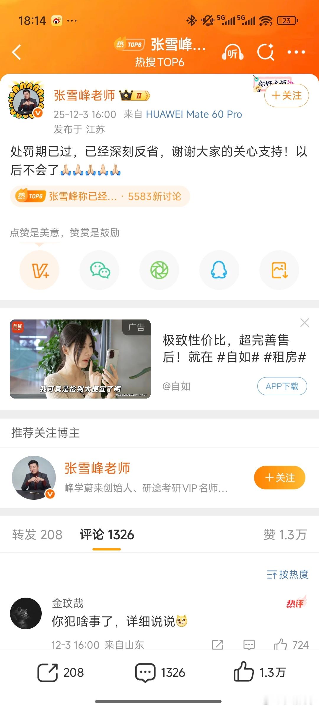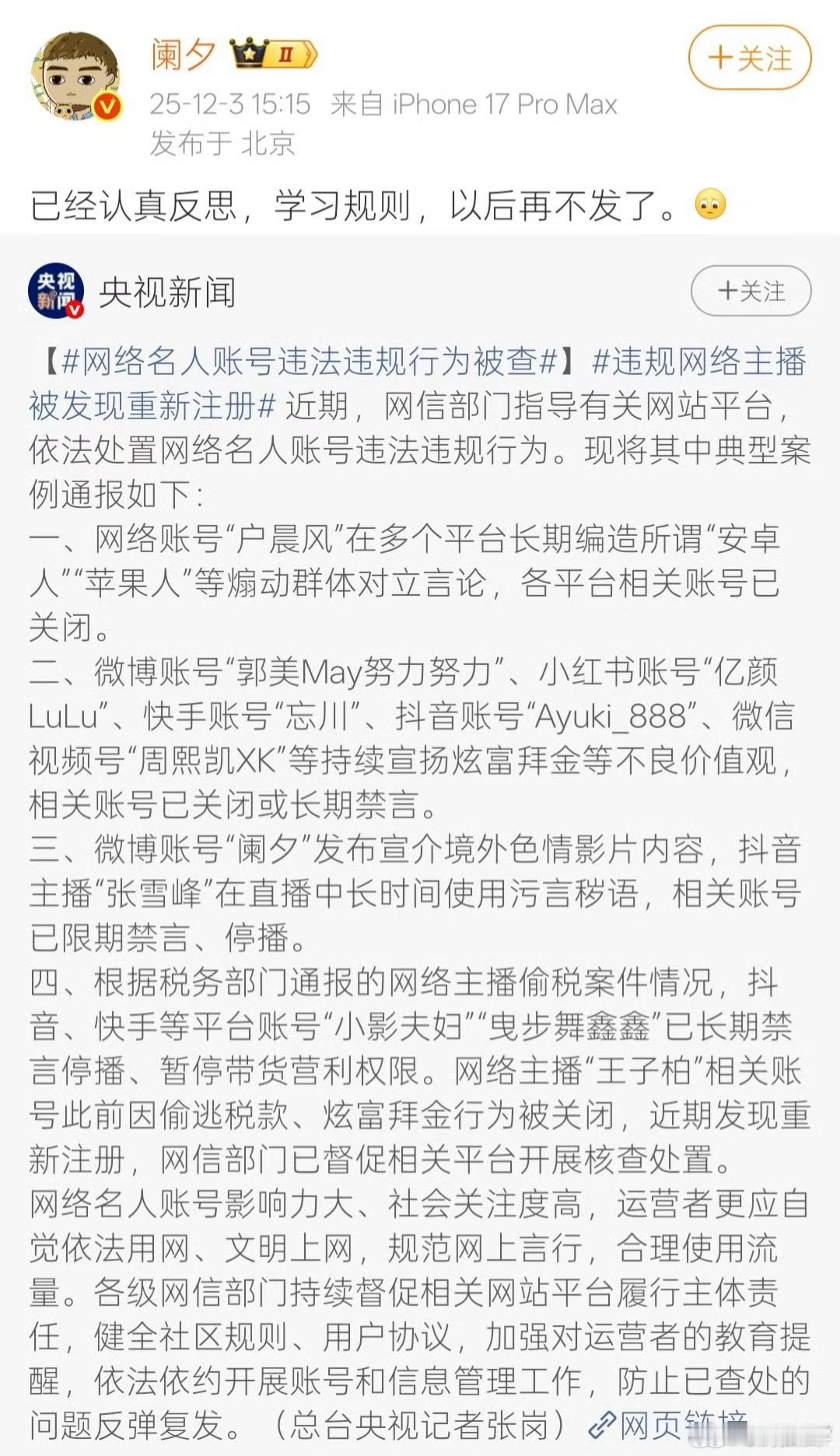 网络名人账号违法违规行为被查 网络名人的一句话就可能引发一场蝴蝶效应,所以一定得谨然慎行。目前名单上张雪峰和阑夕都表示认识到错误,深刻反省。