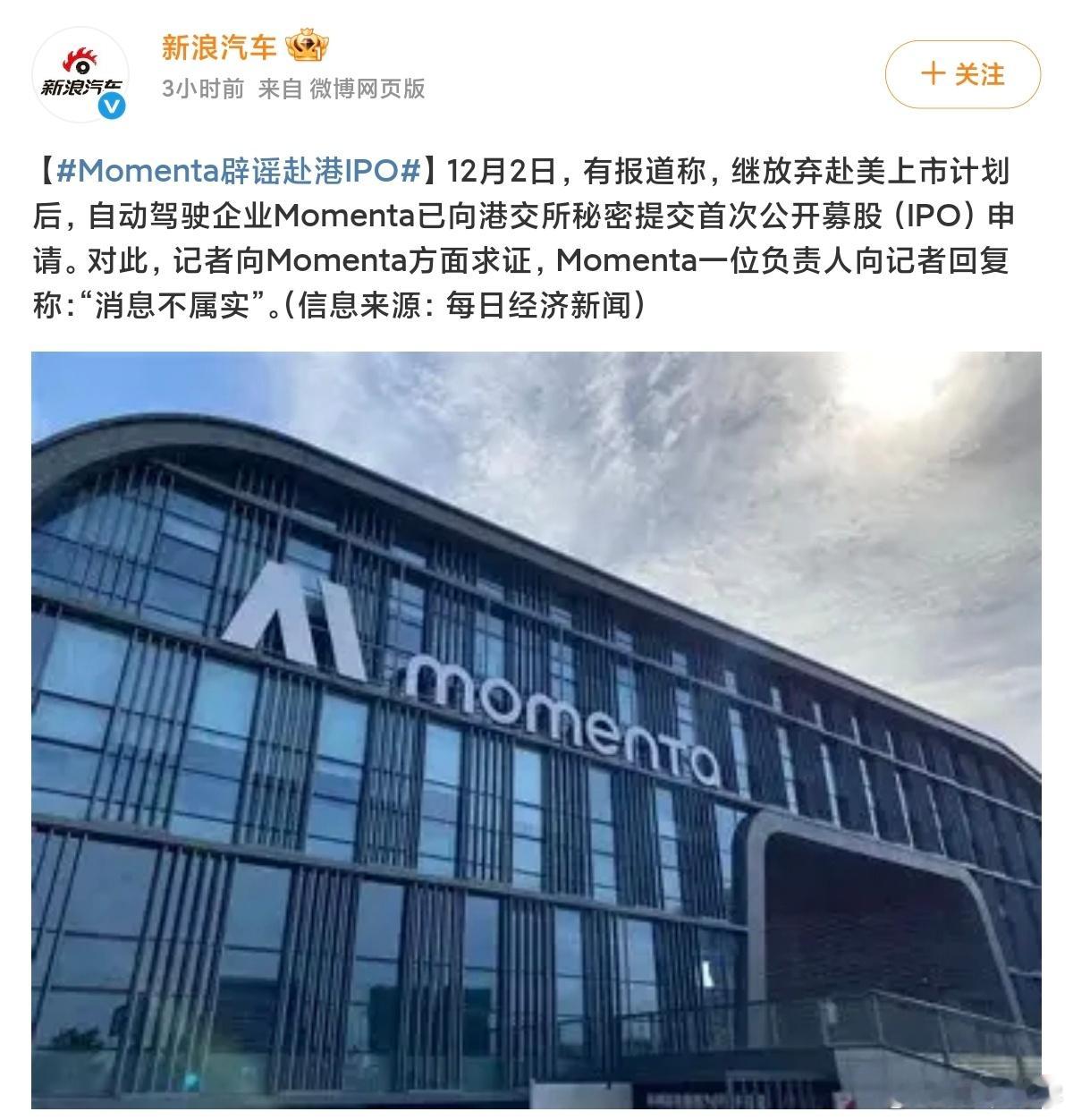 路透社12月3日报道称Momenta秘密提交赴港IPO申请,但未透露发行规模和时间表。Momenta同日回应观察者网称该消息“不属实”,路透社随后撤回相关报道。去年在美国备案失效后,Momenta今年转场香港传闻好像一直也没断,跟辅助驾驶逻辑一样,看见障碍物先刹车,但也没说不绕过去,感觉港交所也是时间问题。momenta辟谣赴港ipo