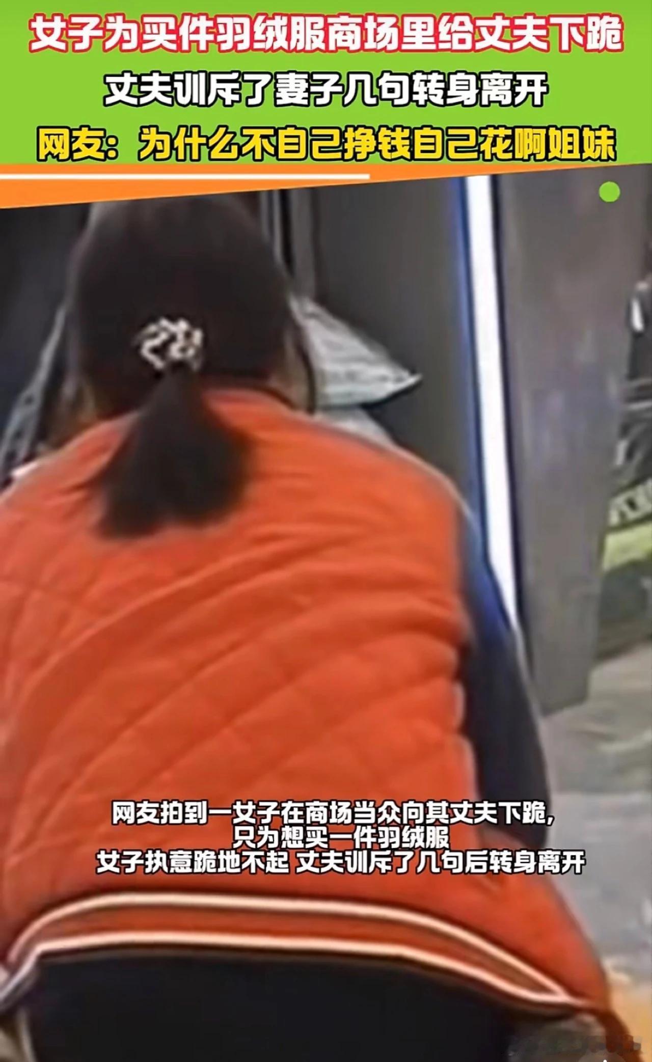 最近,湖北一女子在商场为买羽绒服给丈夫下跪的事儿引发关注。事发商场人来人往,女子大冬天长时间跪地,只为几百块的羽绒服,可丈夫不仅不搀扶,还神气地训斥她。 从穿着看,丈夫打扮靓丽,女子则是老旧外套配大棉鞋,一看就是围着锅台转的家庭妇女。还有个类似事件,老婆挑中 299 元的羽绒服,老公直接拒绝,老婆下跪哭求还遭破口大骂。这一幕真扎心,女人为件衣服如此卑微,可见在家庭地位之低。这也提醒姐妹们,经济独立太重要了,自己有钱才有底气想买啥买啥。