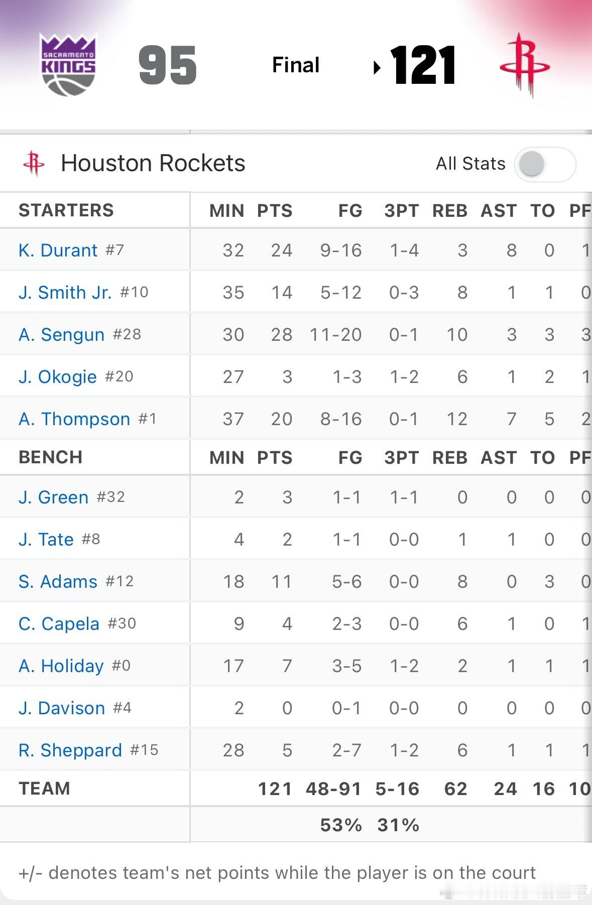 国王vs火箭 拿下拿下!!!全场比赛结束,火箭主场121比95大胜国王!!!我火上半场唯唯诺诺,下半场重拳出击火箭战胜国王休斯顿火箭