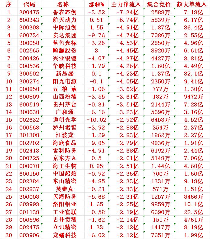 12月4日尾盘30分钟,主力资金大幅卖出的30名单! 香农芯创:净流入 -7.34亿元,集合竞价成交 2588万元 航天动力:净流入 -6.74亿元,集合竞价成交 5839万元 中际旭创:净流入 -4.91亿元,集合竞价成交 1.87亿元 实达集团:净流入 -4.74亿元,集合竞价成交 7086万元 蓝色光标:净流入 -4.53亿元,集合竞价成交 2850万元