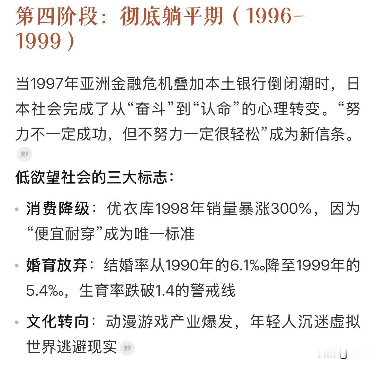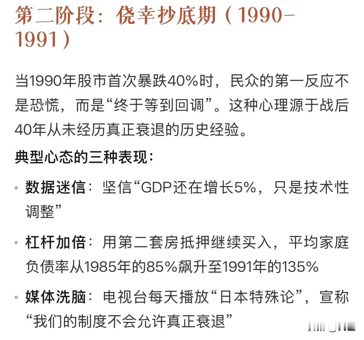日本房地产总结, 第五篇:民众从狂欢到恐慌的心理轨迹 心理轨迹的四个阶段, 从1985-1999年,日本民众经历了人类历史上最剧烈的心理过山车:盲目乐观→侥幸抄底→绝望崩溃→彻底躺平。这不是简单的情绪波动,而是整整一代人被时代车轮碾过的集体创伤。 第一阶段:泡沫狂欢期(1985-1989), “东京地价能买下整个美国”——这句今天听来荒谬的口号,在当时却是全民共识。1987年银座地价达到1亿日元/平米时,人们不是恐惧,而是兴奋。 全民投机的三个心理特征: 1,财富幻觉 :家庭主妇用房产抵押炒股的“渡边太太”现象盛行,认为资产只涨不跌 2,身份焦虑:没买房的年轻人被嘲笑“连未来都买不起”,房产成为婚恋市场硬通货 3,代际传递:父母抵押房产给子女付首付,坚信“现在不买以后更买不起”。 1989年日经指数冲上38915点时,证券公司开户要排队3小时,连出租车司机都在讨论“明天哪只股票会涨停”。 第二阶段:侥幸抄底期(1990-1991), 当1990年股市首次暴跌40%时,民众的第一反应不是恐慌,而是“终于等到回调”。这种心理源于战后40年从未经历真正衰退的历史经验。 典型心态的三种表现: 1,数据迷信:坚信“GDP还在增长5%,只是技术性调整” 2,杠杆加倍:用第二套房抵押继续买入,平均家庭负债率从1985年的85%飙升至1991年的135% 3,媒体洗脑:电视台每天播放“日本特殊论”,宣称“我们的制度不会允许真正衰退” 直到1991年地价开始松动,第一批“负资产”家庭出现——他们的房产价值已低于贷款余额,但多数人仍选择“死扛”。 第三阶段:绝望崩溃期(1992-1995), 1992年GDP增速跌破1%时,民众心理防线彻底崩溃。“原来下跌真的会没有底”成为时代哀歌。 社会心理的三重崩塌: 1,财富幻灭:东京地价三年跌去65%,相当于每个家庭平均损失5000万日元。 2,身份瓦解:大量中产阶级从“年薪千万”沦为“负债千万”,自杀率从1990年的1.6/万人飙升至1993年的2.4/万人。 3,代际创伤:父母用退休金帮子女还贷,形成“老后破产”的恶性循环。 1993年企业倒闭1.3万家,但最刺痛人心的是《朝日新闻》的统计:每10个家庭就有3个在讨论“如果还不起房贷怎么办”。 第四阶段:彻底躺平期(1996-1999), 当1997年亚洲金融危机叠加本土银行倒闭潮时,日本社会完成了从“奋斗”到“认命”的心理转变。“努力不一定成功,但不努力一定很轻松”成为新信条。 低欲望社会的三大标志: 1,消费降级:优衣库1998年销量暴涨300%,因为“便宜耐穿”成为唯一标准。 2,婚育放弃:结婚率从1990年的6.1‰降至1999年的5.4‰,生育率跌破1.4的警戒线。 3,文化转向:动漫游戏产业爆发,年轻人沉迷虚拟世界逃避现实。 最具象征性的是1999年出现的“8050问题”——80岁的父母照顾50岁的失业子女,这种“老后两代破产”成为日本特有的社会现象。 代际差异的永久撕裂, 这场心理创伤造成了日本社会至今未愈的代际裂痕: 财富观: 泡沫世代(1965-1975生),“资产永远上涨”,失落世代(1975-1985生),“现金为王”; 职业观 : 泡沫世代(1965-1975生),“终身雇佣理所当然”, 失落世代(1975-1985生),“随时可能失业”; 消费观: 泡沫世代(1965-1975生),“先买后还”, 失落世代(1975-1985生),“非必要不消费”; 正如社会学家山崎元所言:“日本用30年教会了一代人:努力不会成功,躺平不会饿死”。 日本房产 日本楼市 日本房地产泡沫爆发的结局是什么? 房市冷思考