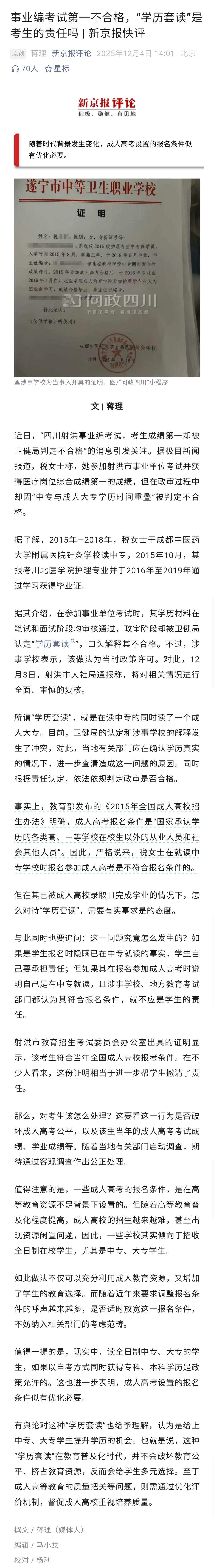 对于“学历套读”,有些基本问题要理清: 1、中专在读期间,再自考专科、本科,这是符合政策规定的。中专学历、自考文凭都会得到认可。 2、中专在读期间,按规定,不能报考成人高考,被成人高校录取,攻读成人专科,获得成人专科学历。 3、但是,在现实中,存在部分中专,与成人高校的合作,允许中专在读学生参加成人高考,同时读成人专科。一些地方教育考试部门也支持。认为这属于扩大学生选择的改革。但从政策角度,这是“违规”的。 4、要调查清楚,究竟是学生在报名参加成人高考时,存在弄虚作假行为,还是涉事学校、当地教育考试部门都清楚,允许其报考。如果是学生的问题,学生要承担违规的后果。而如果是涉事学校、当地教育考试部门的问题,这不能由学生承担责任,要给这类“学历套读”学生明确的说法。学生同时完成成人专科学习,获得事业单位招聘考试第一的努力应该被看见。 5、在高等教育进入普及化时代后,应考虑取消成人高考的报名限制,和自考一样,可允许在校生也报考,同时读成人文凭。就如本科院校允许学生攻读双学位一样。这会扩大学生的教育选择权。 6、舆论质疑成人专科、成人本科的含金量,这需要成人高校重视质量把关,而不是“贩卖文凭”,这也才能消除社会对成人高等教育的歧视。
