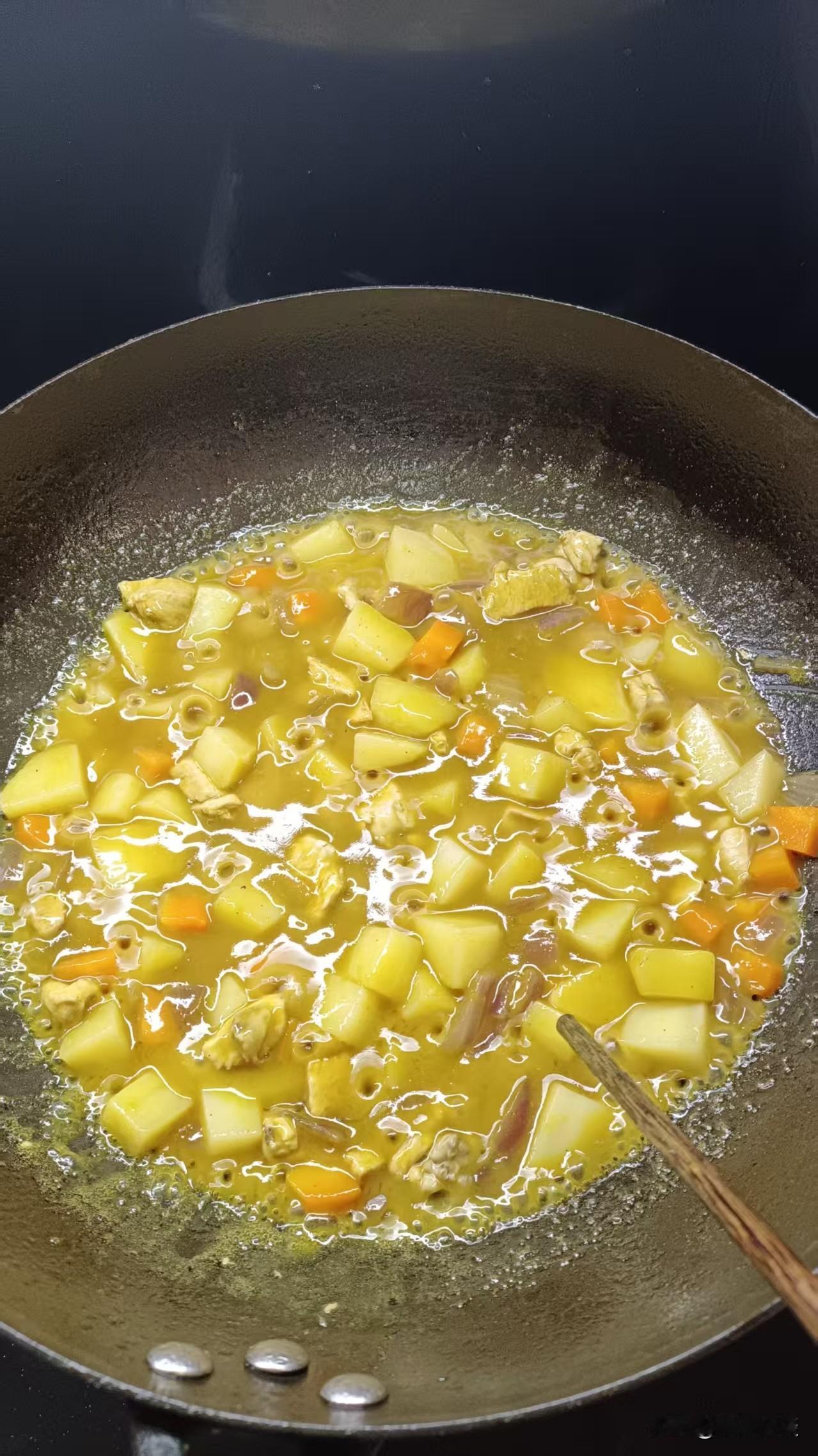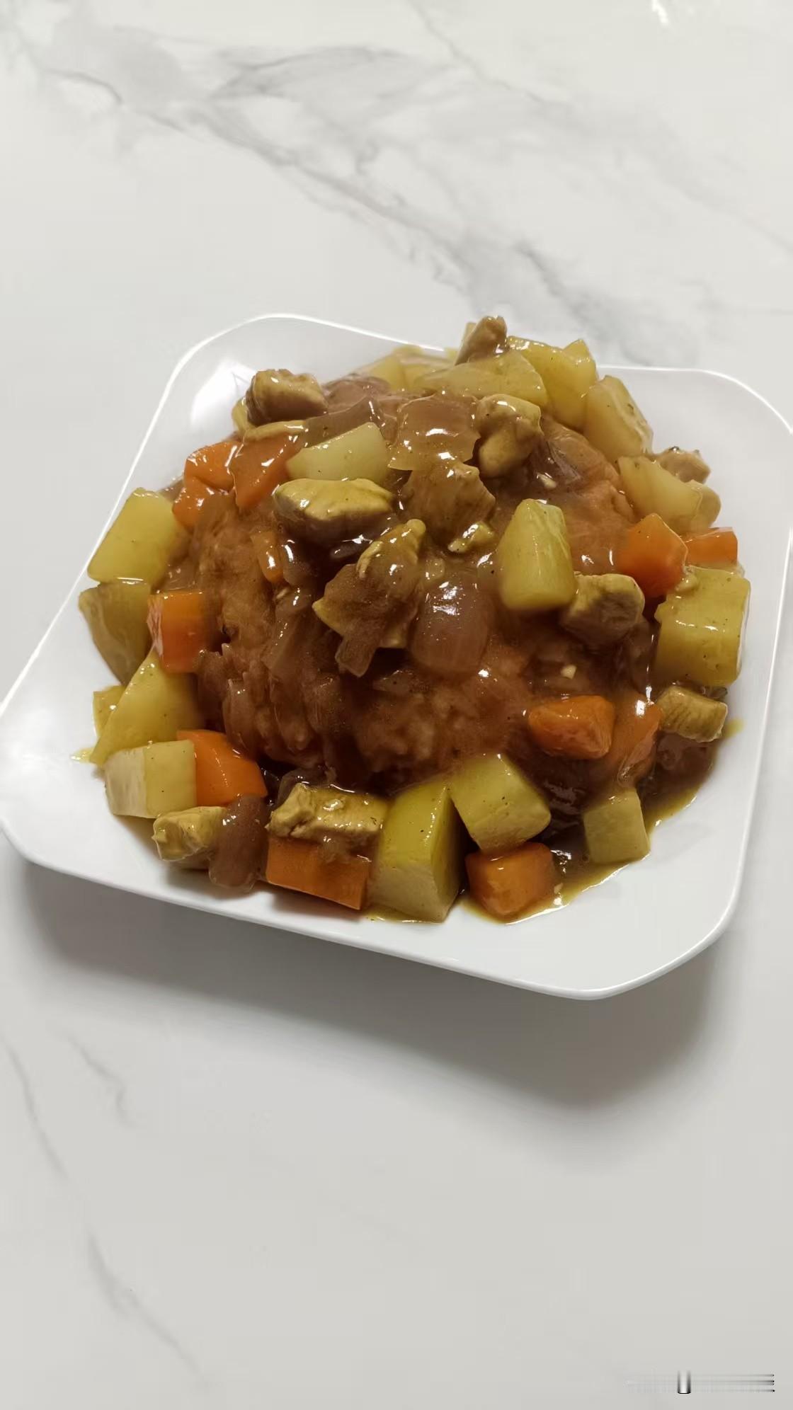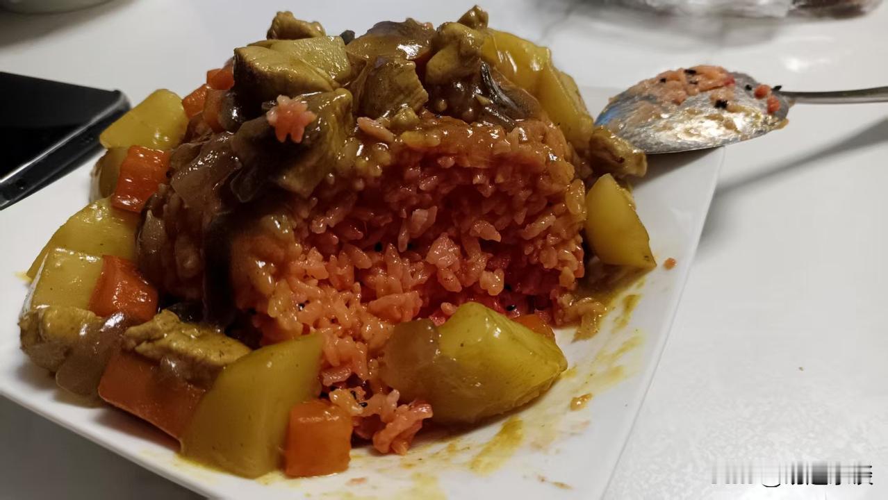 火龙果米饭+咖喱鸡块套餐,对于我这个做饭小白来说,这是个挑战而且家里小宝不是个好糊弄的主!硬着头皮上吧,本来这也不是我的强项! 1.三个人吃饭的米饭量+一个红芯火龙果放电饭锅蒸熟 2、准备好食材:土豆2个切块、胡萝卜半根切块、洋葱半颗切块、咖喱半块、鸡胸肉 200克切肉块 3、炒菜锅热放油,把洋葱放到锅里抄出香味,放入鸡胸肉,断生 4、放入胡萝卜和土豆块,断生并加适量水,等快出锅再加咖喱块 优点:除了做熟了没有优点 缺点:米饭加火龙果太少,菜量少两个配起来颜色跟下了毒似的 一家三口最后一致评价,做的一般,大家还是给面子吃了一口,只有我自己弄了一大碗,自己做的,自己吃!