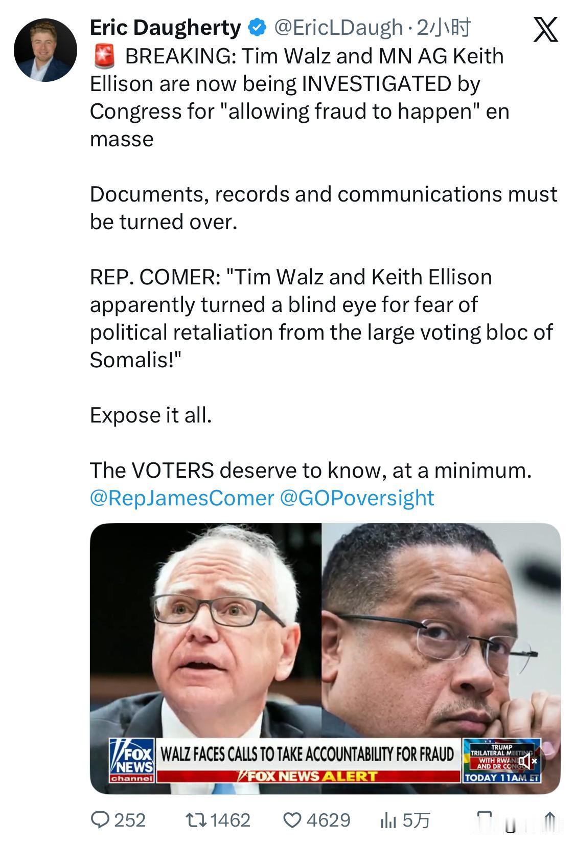 突发新闻:明尼苏达州州长蒂姆·沃尔兹和州检察长基思·埃里森正因“放任大规模舞弊行为发生”而受到国会调查。 文件、记录和通信必须移交。 科默议员:“蒂姆·沃尔兹和基思·埃里森显然是出于害怕遭到索马里庞大选民群体的政治报复而视而不见!” 全部揭露出来,选民至少有权知道真相。
