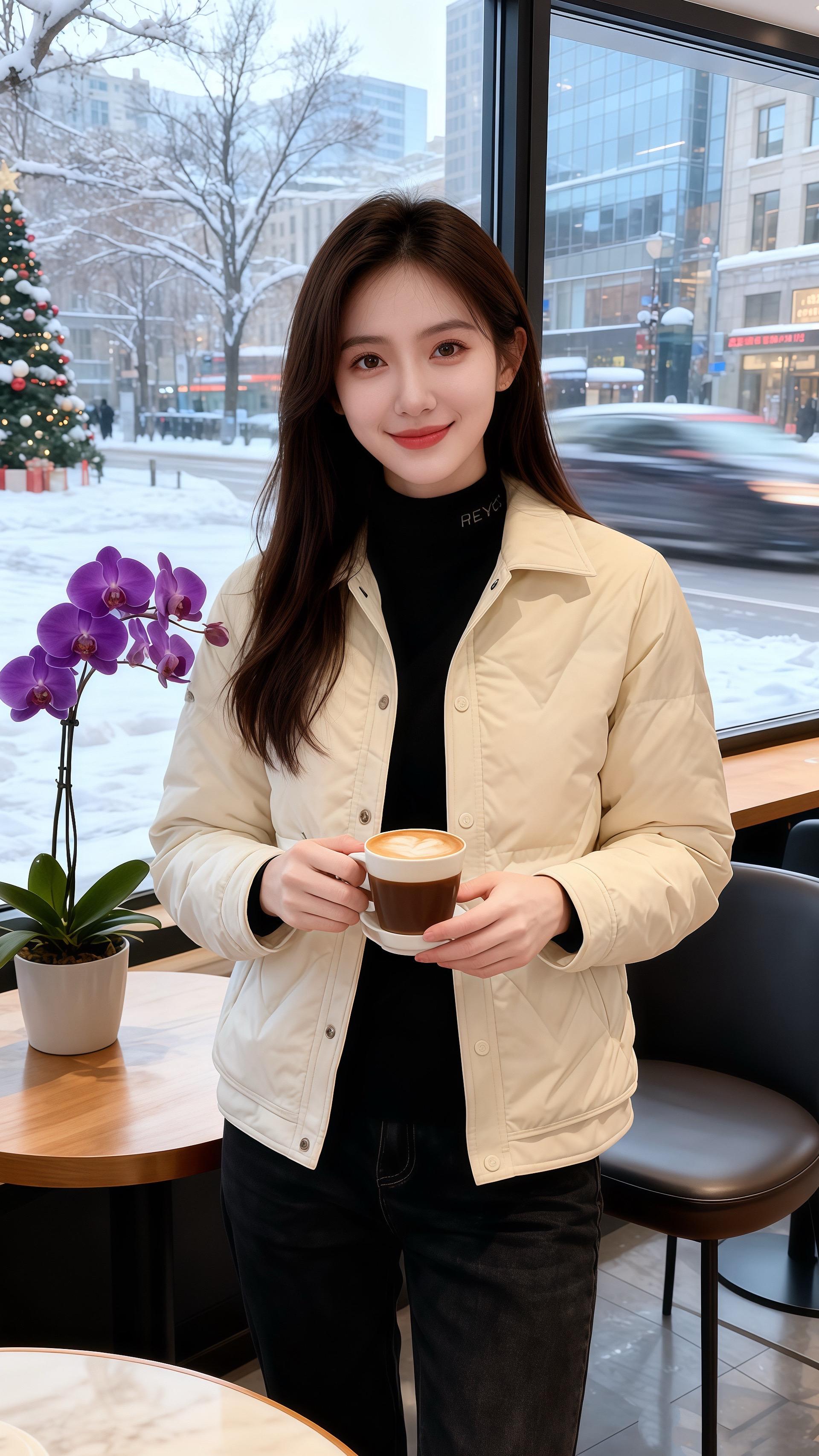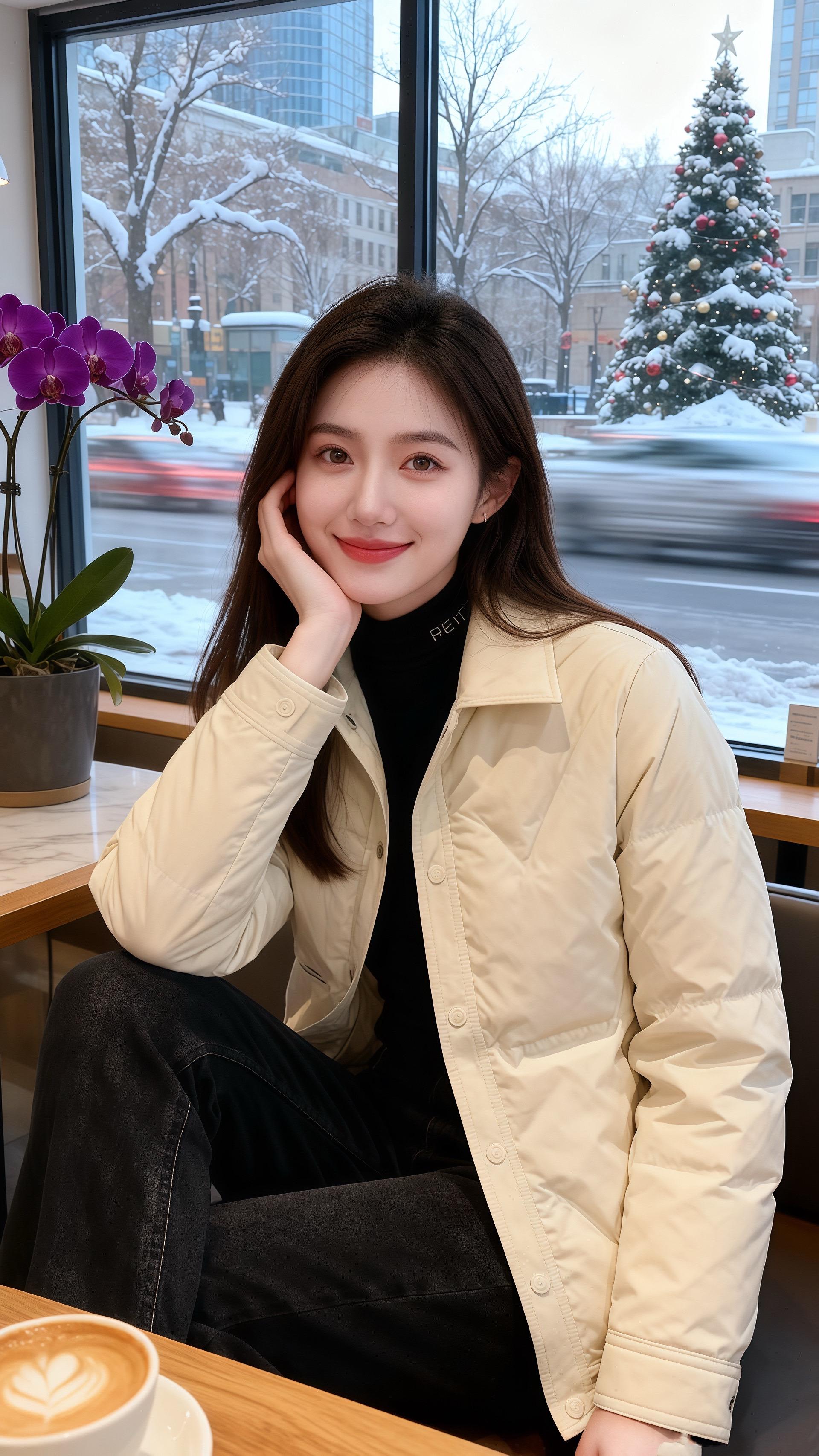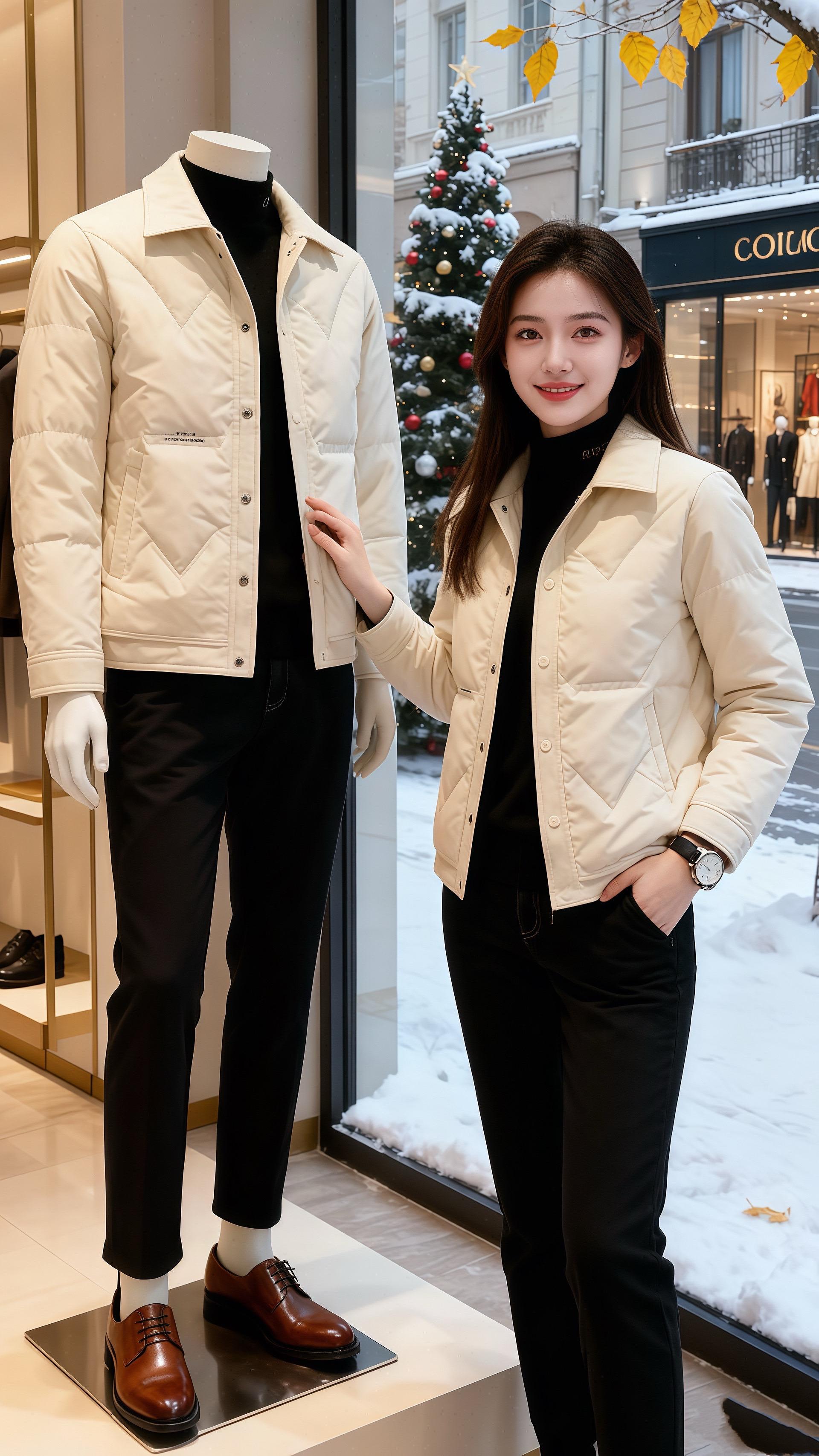 苏晚抿了口咖啡笑,伸手换了件米白色棉服披上,领口的翻领弧度柔和,面料摸着绵软却不塌。陆则的目光顿了顿,伸手替她理了理袖口:“这件米白的更衬你,和窗外的雪衬在一起,把棉服的温柔感穿出来了,还和店里的焦糖拿铁一个调调。”