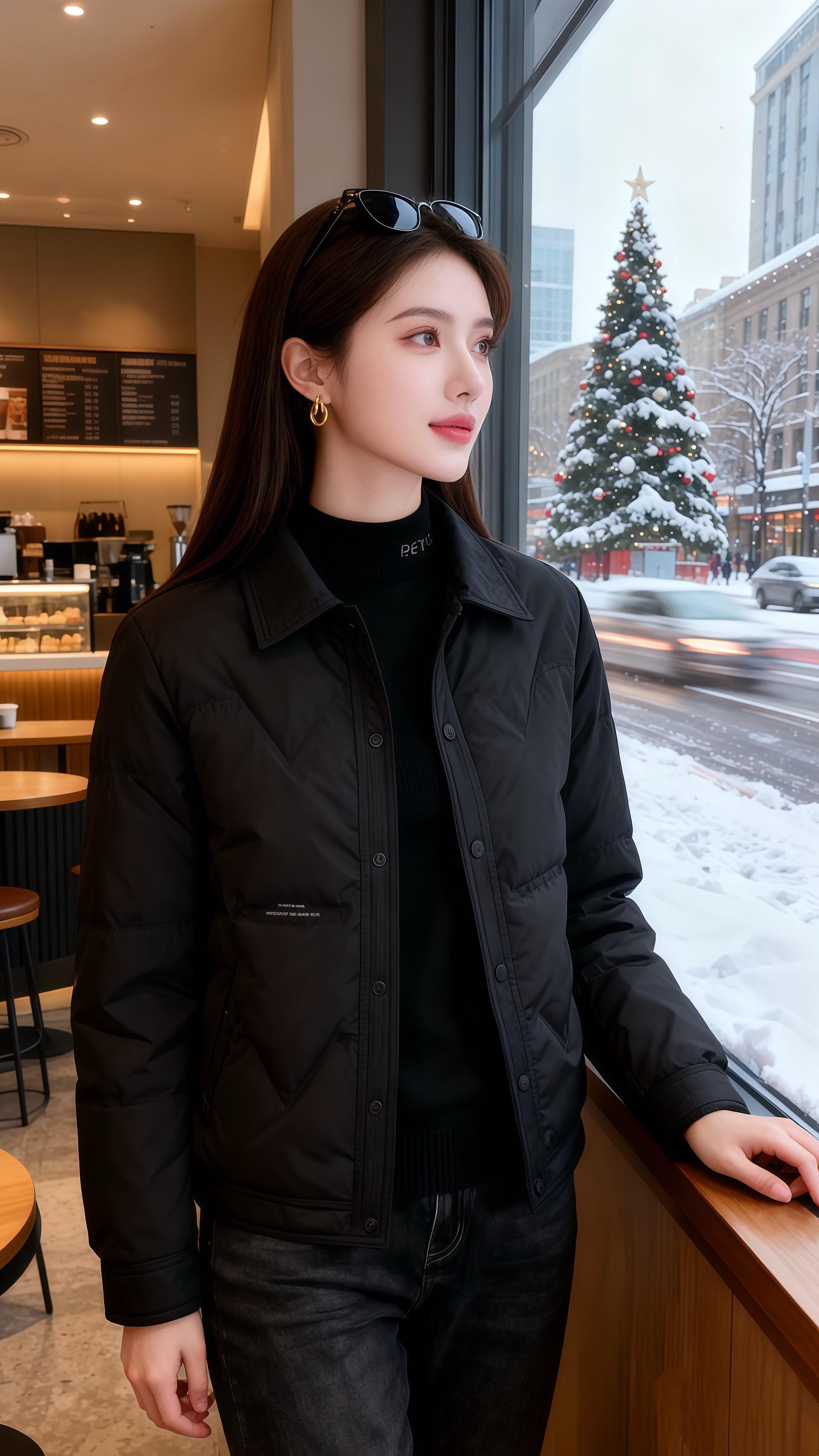 落地窗外的雪裹着圣诞树晃悠,苏晚刚脱下黑色菱格棉服,转身就撞进陆则含笑的视线里。他把热拿铁推过来,指尖点了点她搭在椅背上的棉服:“这件黑棉服的版型很利落,菱格纹路压得规整,配高领衫一点不臃肿。”
