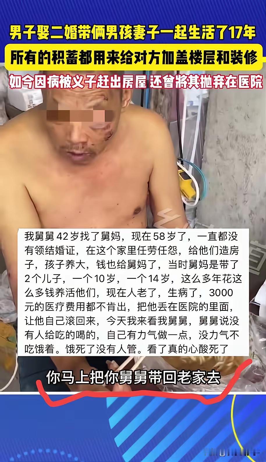 寒心到骨子里! 17年掏心掏肺当亲爹养, 一场病就被继子扫地出门,这哪是养儿防老,分明是养了两只白眼狼! 河南大哥把挣的钱全砸给继子盖房装修,从小拉扯到大的付出,在对方眼里竟抵不过“没有血缘”四个字。 都说生恩不如养恩大,可现实是,没装着真心的养育,再久也暖不透凉薄的人心。更扎心的是,法律都明确了,继父母尽了抚养义务,继子女就该赡养,可这俩小伙子连做人的底线都丢了。 善良从不是无底线的付出,掏心之前得先看清对方值不值得,别让自己的真心,最后变成别人践踏你的资本。 你觉得重组家庭里,该怎么平衡付出与防备?来评论区聊聊你的看法~ 人性冷暖 重组家庭那些事