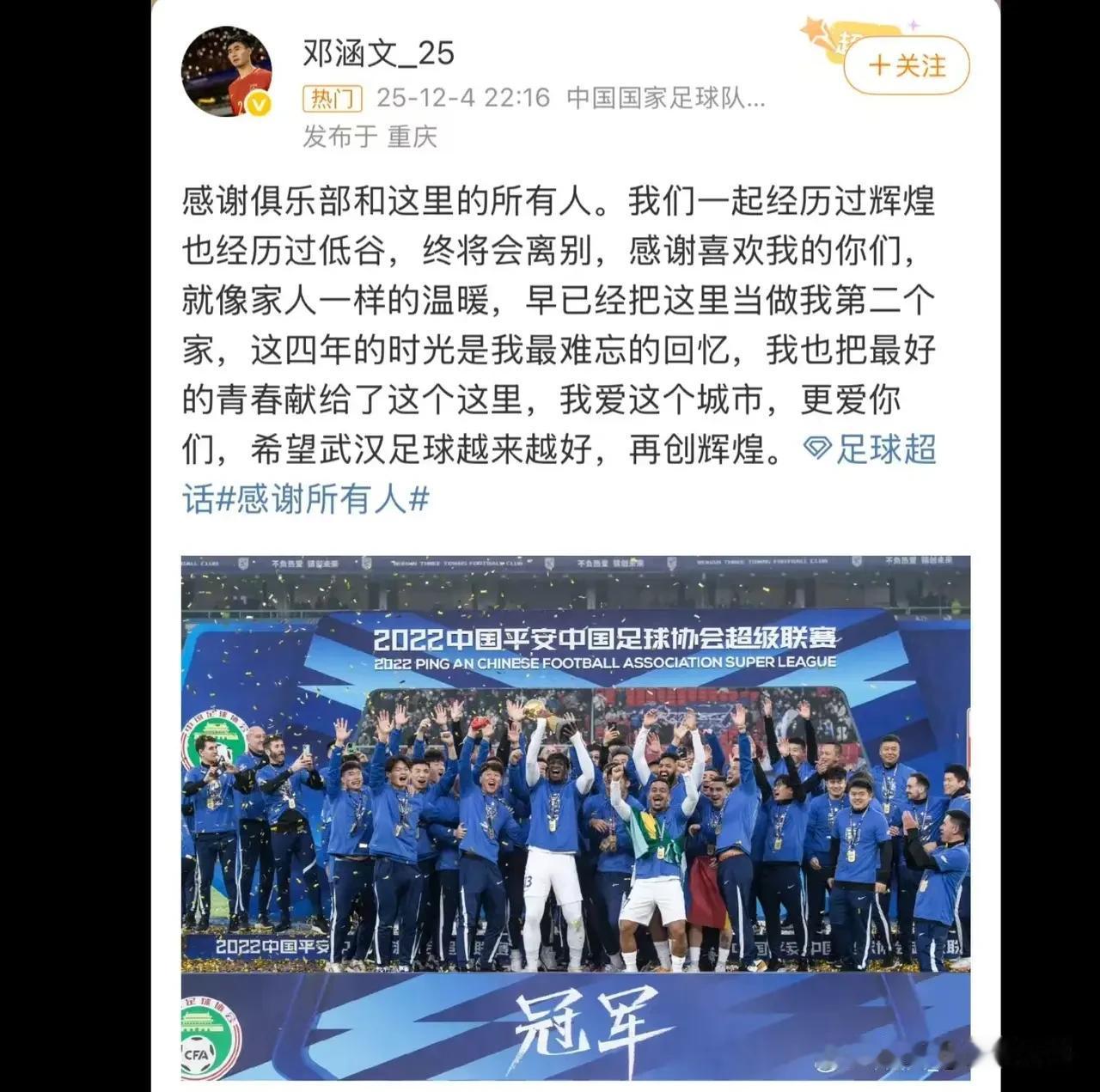 庙小留不住真佛,邓涵文最终还是和武汉三镇分道扬镳! 据称三镇俱乐部为了能够留下邓涵文这位最后的冠军球员曾经向其开出了顶薪,但是依然没有让其心动,最根本的原因不外乎以下几点: 1、股改失败的三镇常年在保级漩涡里徘徊,让邓涵文的特点和优势很难得到充分的发挥,长此以往对自己的职业生涯将会是一大损害,为了接下来能否获得一个会更好的机遇和平台,邓涵文不得不做出离队的决定。 2、据传邓涵文想获得一份长期的保障性合同,不过三镇考虑到对方已经31岁,职业生涯已经开始走下坡路了,准备在顶薪的基础上给予一份1+合同,这也引起邓涵文的不满,期间一家南方球队(小编认为大概率是新鹏城)愿意开出长约合同,因此才促使邓涵文另投他处。 不管怎样,就目前邓涵文的能力和状态,无论前往中超哪支球队,在右后卫的位置上还是有他的一席之地的![作揖][作揖][作揖]