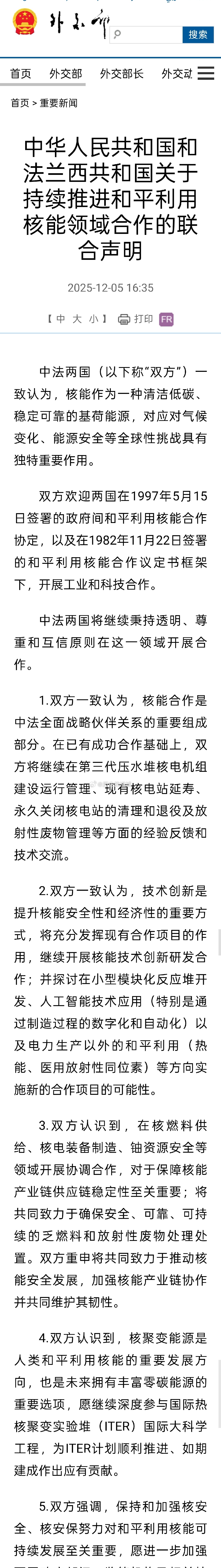 马克龙说此行只有一个遗憾法国总统马克龙访华第三天行程期间,中法双方公布《中法关于持续推动和平利用核能领域合作的联合声明》,联合声明中表明,中法双方将继续深度参与国际热核聚变实验堆(ITER)国际大科学工程,为ITER计划顺利推进、如期建成作出应有贡献。 两国将探讨小型模组化核反应器的开发及人工智能技术应用等实施新的合作项目。 中国并赞同法国提出的关于在2020年至2050年期间将全球核能增至三倍的宣言。 声明指出,中法两国将在1997年《政府间和平利用核能合作协定》及1982年《和平利用核能合作议定书》的框架下,开展工业和科技合作。 双方一致认为,将充分发挥现有合作项目的作用,继续开展核能技术创新研发合作;并探讨在小型模组化反应器开发、人工智能技术应用(特别是透过制造过程的数位化和自动化)以及电力生产以外的和平利用(热能、医学放射性同位素)等方向实施新的合作项目的可能性。 认识到在核燃料供应、核电装备制造、铀资源安全等领域开展协调合作,对于保障核能产业链供应链稳定性至关重要;中法将共同致力于确保安全、可靠、可持续的乏燃料和放射性废物处理处置。 声明并提到,双方体认到,核融合能源是人类和平利用核能的重要发展方向,也是未来拥有丰富零碳能源的重要选项,愿继续深度参与国际热核聚变实验堆(ITER)国际大科学工程,为ITER计划顺利推进、如期建成作出应有贡献。 双方重申对国际核不扩散体系的承诺,特别是对《不扩散核武器条约》的承诺,并强调国际原子能机构在确保核安全、核安保和核不扩散义务方面发挥着核心作用。 两国将与国际原子能总署一道,将在资金可及并符合各自国内法律要求的前提下,为实现上述目标提供所需的必要资源。双方承诺,支持国际核能发展,依照核安、核安保和核不扩散的国际义务,实现能源结构低碳化。 此外,双方认识到发展全球核能的理想抱负。 作为加速实现碳中和承诺的一部分,中国赞同法国提出的关于在2020年至2050年期间将全球核能增至三倍的宣言。