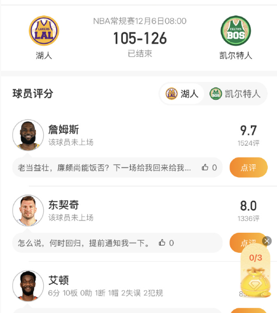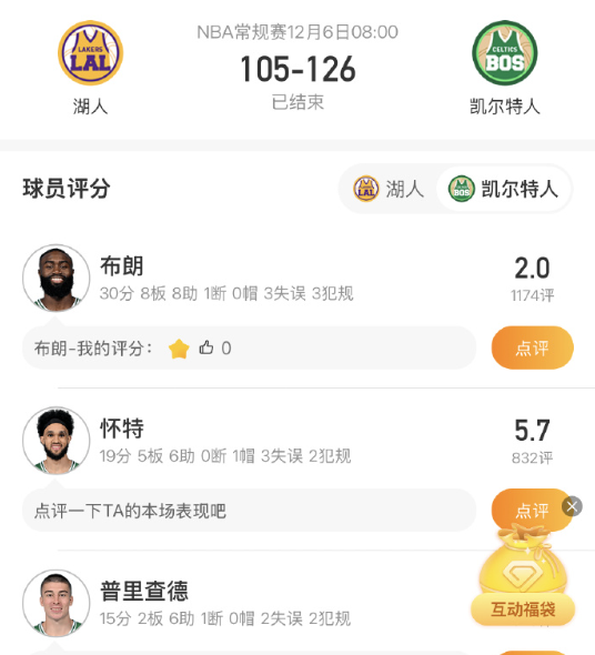 凯尔特人21分大胜湖人 NBA常规赛上演黄绿大战,凯尔特人126-105战胜湖人,布朗砍下30分。湖人方面,詹姆斯东契奇缺阵,里夫斯单核带队砍下36分8助攻。