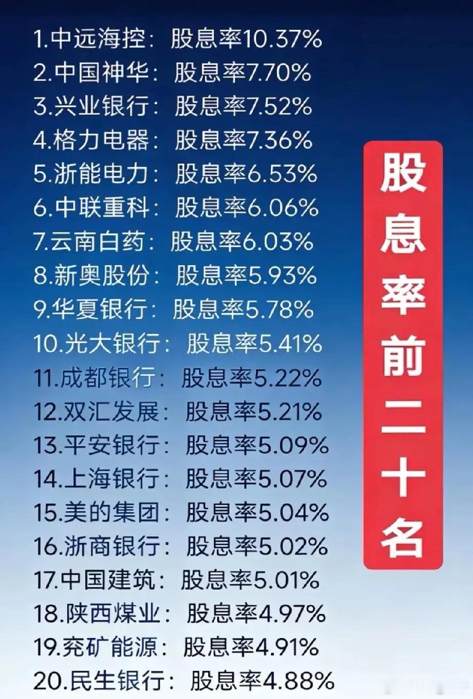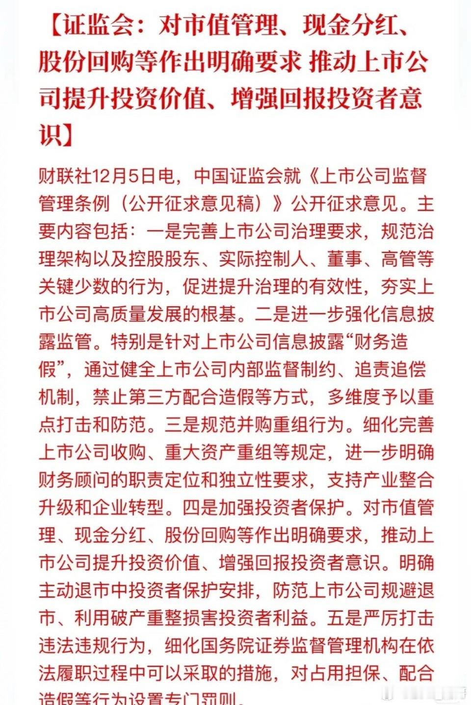 重磅利好!12月5日晚间消息证J会新规征求意见:从治理、信披到投资者保护,给上市公司划“硬杠杠”——规范市值管理、现金分红,严打财务造假,既要上市公司提质,更要让投资者真受益。那么A股低估值高股息公司有哪些?1.政策催化下的国资高股息概念涵盖银行、煤炭、建筑等多行业,像工行、中国神华这类央控上市公司,后续现金分红或更给力。2.近一年股息率排名前20的公司有中远海控、中国神华、陕西煤业、格力电器,以及四大银行等等。3.今年以来涨幅不高、股息率高的公司清单来了:广汇能源股息率超12%,格力、云南白药等龙头也在列,覆盖能源、消费、金融多领域。
