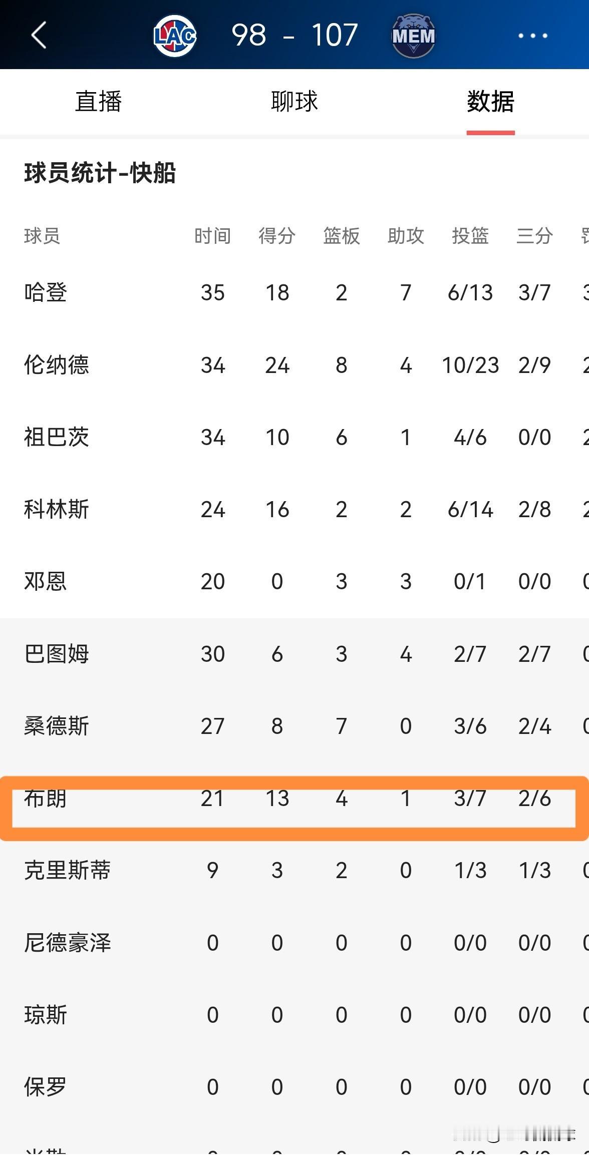我强烈建议快船主帅泰伦-卢重用布朗!尽管今天快船在客场以98:107不敌灰熊,但是布朗的表现却是可圈可点,他在替补出战的21分钟里,投篮7中3,其中三分球6中2、罚球6中5得到13分4篮板3抢断,他的场上正负值为-1。 如果卢教练能够将布朗提上首发,那么我相信快船首发阵容的防守实力会更强,更重要的是,一旦哈登在场上出现防守漏人,布朗能够为哈登补锅。