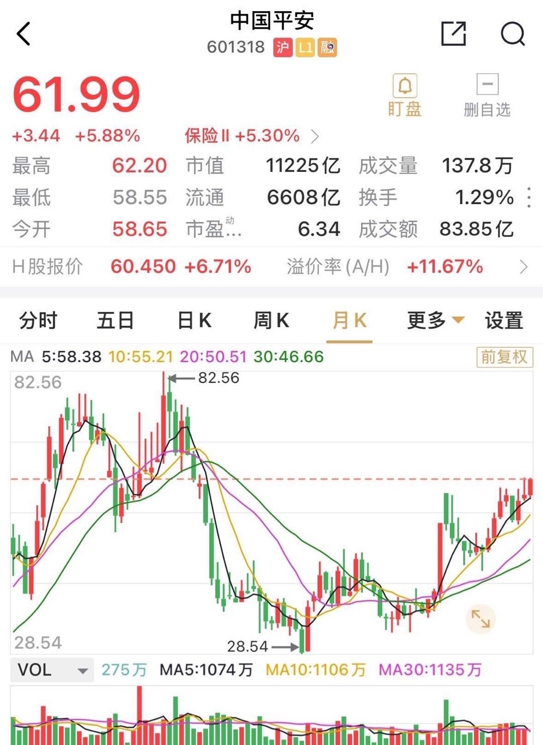周末保险板块的强劲表现来源于盘后的消息,对保险类资金进入股市放松了年限要求,保险资金作为A股市场的重要组成部分,这有利于长线耐心资本的投资运作。这使平安保险再次成为市场的热点,午盘有资金估计提前预判,平安涨幅5.88%,收61.99元,距离11月的前高点62.27元,仅有一线之遥,创下2021年以来的收盘新高。平安目前处于多头趋势中,冲破前高之后,历史高点82.0元便近在咫尺,距离现价还有30%的空间。银行股能创历史新高,保险茅凭啥不能。月线向上突破,30%的预期空间,这会是未来三个月,对中国平安确定性强,无风险收益的正确研判否?