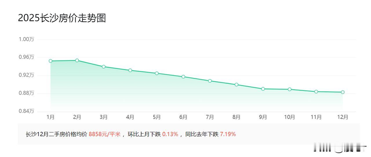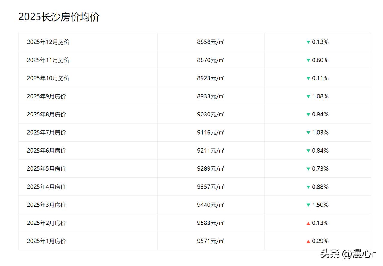 2025年1月,长沙房价均价9571元; 2025年2月,长沙房价均价9583元; 2025年3月,长沙房价均价9440元; 2025年4月,长沙房价均价9357元; 2025年5月,长沙房价均价9289元; 2025年6月,长沙房价均价9211元; 2025年7月,长沙房价均价9116元; 2025年8月,长沙房价均价9030元; 2025年9月,长沙房价均价8933元; 2025年10月,长沙房价均价8923元; 2025年11月,长沙房价均价8870元。 2025年,长沙的房价趋势是稳中有降,和年初1月份对比,截至11月份,均价将了约700,参照历史数据,在接下来的12月份,或许还会有一个微降,因为年底很多房企为了完成全年任务指标,不排除会以价换量。 其实长沙的房价长期来看,主要还得看长沙的经济发展和净流入人口。不过,漫心r觉得,长期来看,长沙的房价是会涨的,只不过,这个涨是和经济增长同频的,而不会是出现前几年的暴涨暴跌。2025年长沙前三季度的GDP增长约5%,经济表现不错,2024年长沙新增常住人口10.39万人,人口增速排名全国第三。那么,大家觉得长沙的房价未来会在多少区间内是合理的呢?评论区聊一聊。
