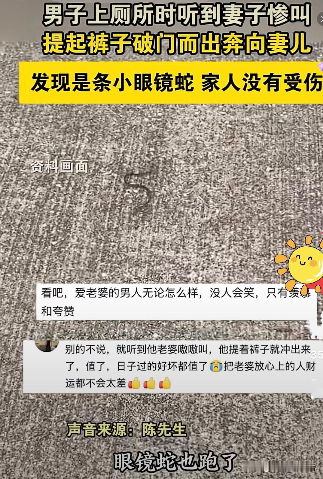 提裤狂奔护妻儿!男子厕所里听到老婆惨叫,这反应太圈粉了! 谁懂啊!有个把老婆放心上的男人,关键时刻真能救命! 这个暖心视频火了 男子正上厕所,突然听到老婆凄厉惨叫,二话不说提着裤子就破门而出,直奔妻儿身边,原来竟是条小眼镜蛇闯进门,好在家人没受伤,真的有惊无险! 网友看酸了! “这才是真男人!粪不顾身提裤狂奔,把老婆放在心尖上了” “别的不说,就这反应速度,日子过得再普通都值了” “爱老婆的男人果然有担当,这样的人财运不会差”。 还有人说,那些天天喊“女人不需要男人”的,看看这场景就知道,危机时刻的守护有多重要,其实不是女人离不开男人,而是被人拼尽全力保护的感觉,真的太踏实了! 你们身边有这样有担当的另一半吗? 遇到危险时他/她会第一时间冲过来吗? 来评论区晒晒你的神仙伴侣,让大家羡慕羡慕!