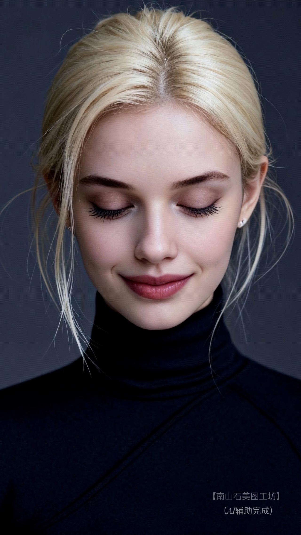 浅金长发似鎏光倾泻,高领黑衫衬出天鹅颈的优雅弧度。眉眼轻阖如盛星芒,唇角微扬漾柔光,深灰底色里,她是具象的诗意,每缕气韵都糅着矜贵与温柔,一眼沉醉于这份静谧高级之美。
