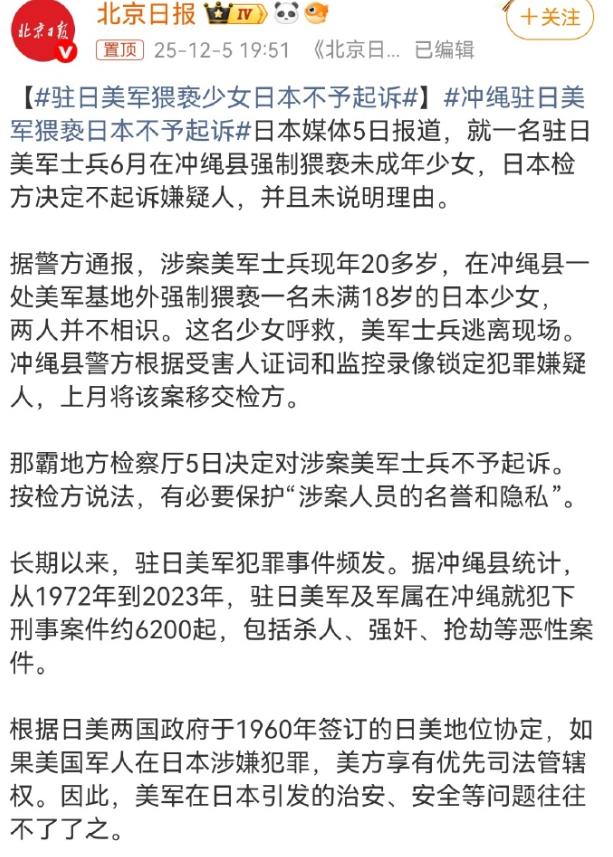 美军士兵猥亵冲绳少女不起诉:日美同盟阴影下的法治困局 冲绳的夏日海风依旧咸涩,但比海风更刺痛人心的是一则冰冷的司法通告——那霸地方检察厅5日宣布,对涉嫌强制猥亵未成年少女的驻日美军士兵不予起诉。监控录像清晰记录罪行,受害人证词确凿,但检方仅以“保护涉案人员名誉和隐私”为由终结案件,未透露任何法律依据。 这起事件撕开了日美关系中最顽固的疮疤。冲绳承载着全日本70%的美军基地,却长期承受着性犯罪、坠机事故与噪音污染的代价。此次不起诉决定赤裸裸揭示了东京的优先选项:维护《日美地位协定》赋予美军的治外法权,远比捍卫冲绳民众的法治尊严重要。 冲绳县知事玉城丹尼曾多次要求修改协定中“美军犯罪优先由美方处置”的条款,但中央政府的沉默已成常态。值得注意的是,事件曝光恰逢日本通过新版《国家安全保障战略》之际,当局正急于强化与美国的军事捆绑。这种背景下,冲绳人的愤怒可能成为动摇“安保依赖美国”国策的杠杆。 法律学者指出,类似案件若涉及日本国民,检方至少会公开基本处置理由。而此次的彻底缄默,暴露出日本司法系统在同盟政治前的功能性妥协。当美军士兵的“隐私权”凌驾于少女的正义诉求时,所谓“自由开放的印太”显得格外荒诞。
