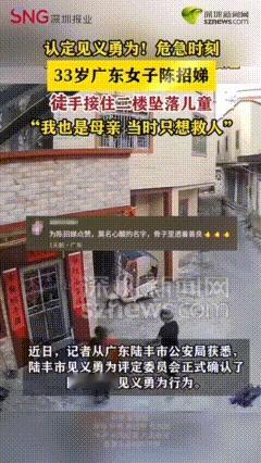 真是好心有好报!广东陆丰,陈女士徒手接住二楼跌落的孩子,孩子毫发无伤,2个月后被评见义勇为。 陈女士在街上听到孩子哭啼声,环顾一周,仔细发现二楼有一位幼童悬挂在二楼阳台外墙沿,随时有掉落危及生命的风险。 陈女士一边大声呼救,一边守在一楼观察孩子的情况,想去二楼救,又怕离开后幼童掉落下来,在折返之际,幼童掉落,陈女士奋不顾身,徒手接住掉落的孩子,所幸孩子没有受伤,陈女士大腿轻微伤。 事后,陈女士表示:“我也是妈妈,当时想不到那么多,第一反应就是救人。” 幼吾幼以及人之幼,宝妈陈女士设身处地,奋不顾身救幼童实为大爱,为她点赞,见义勇为当之无愧!